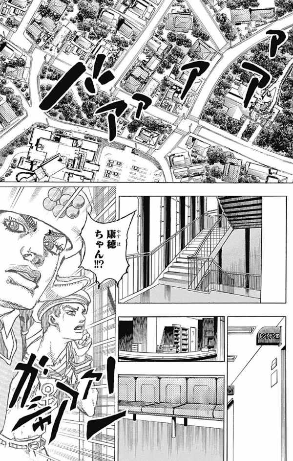 ジョジョリオン 26 - JOJOLION 26 透龍の忠告を無視し虹村京へ電話をかける康穂。しかし、10000m上空では一機の航空機から部品が康穂めがけて落下しようとしていた! 一方、定助は瀕死状態の豆銑が発した言葉「見えないヤツ」の意味に近づき…!?