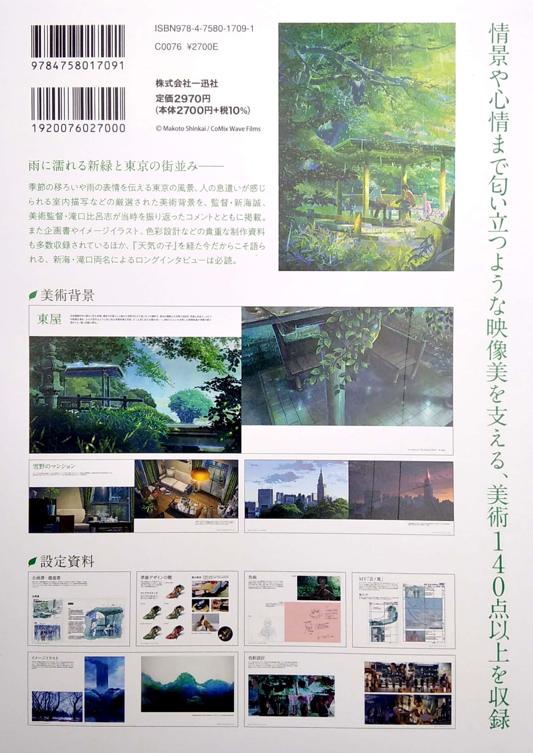 新海誠監督作品 言の葉の庭 美術画集 劇場公開から8年のときを経て、ファン待望の美術画集がいよいよ発売。 自分にとってはある意味、小さな工芸品のような映画です。 (収録インタビューより一部抜粋)――新海誠 『天気の子』で再タッグを組んだ監督・新海誠と美術監督・滝口比呂志のとりおろしインタビューを収録! 140点を超える美術背景に加え、新海誠監督による企画書や絵コンテなど貴重なメイキング素材も圧倒的ボリュームで掲載。