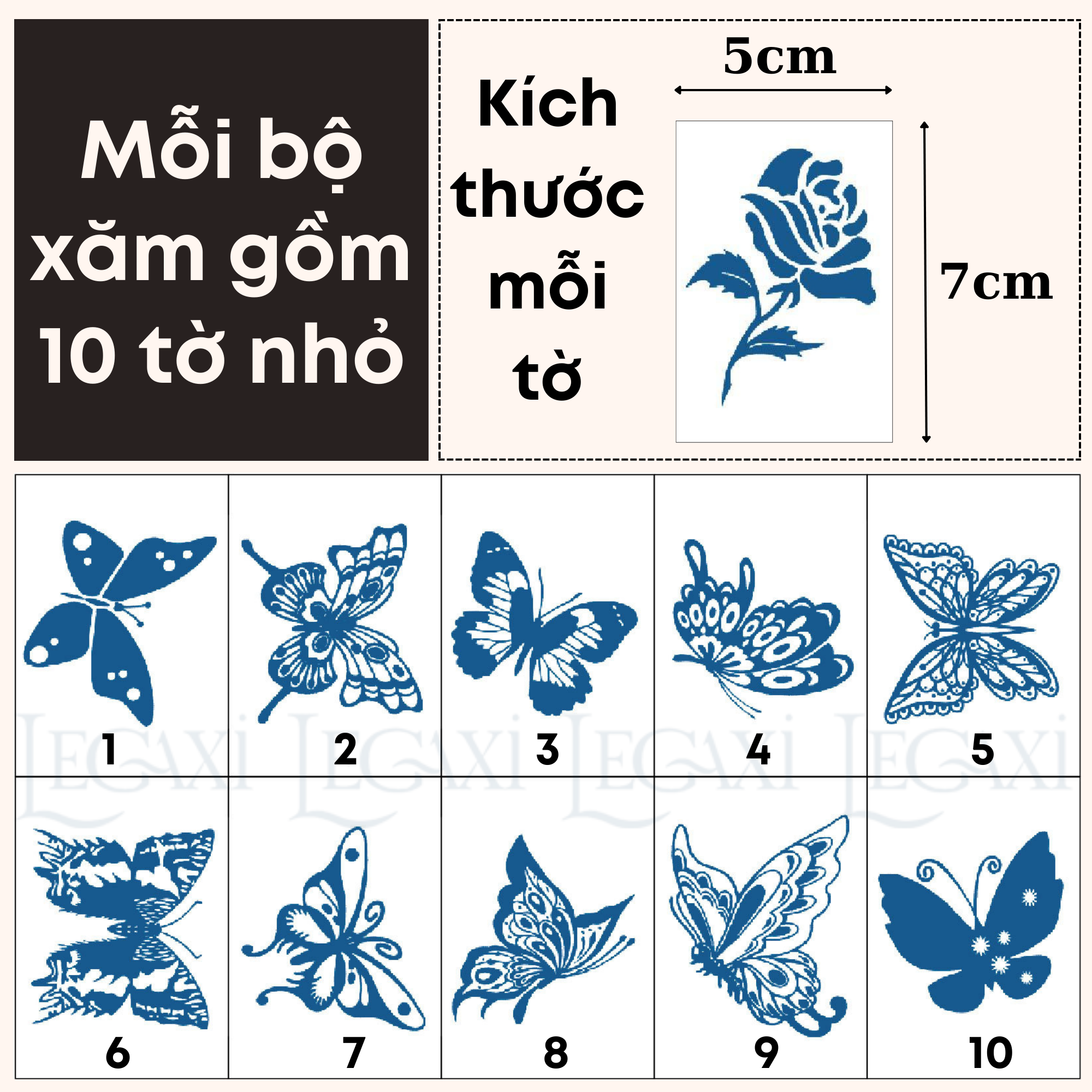 Số lượng 1 tương ứng 1 set 30 tờ Kích thước mỗi tờ xăm 4.5*7cm. Dễ dàng sử dụng nhanh chóng, chỉ mất 1 phút để có ngay 1 hình xăm cá tính. Hình sử