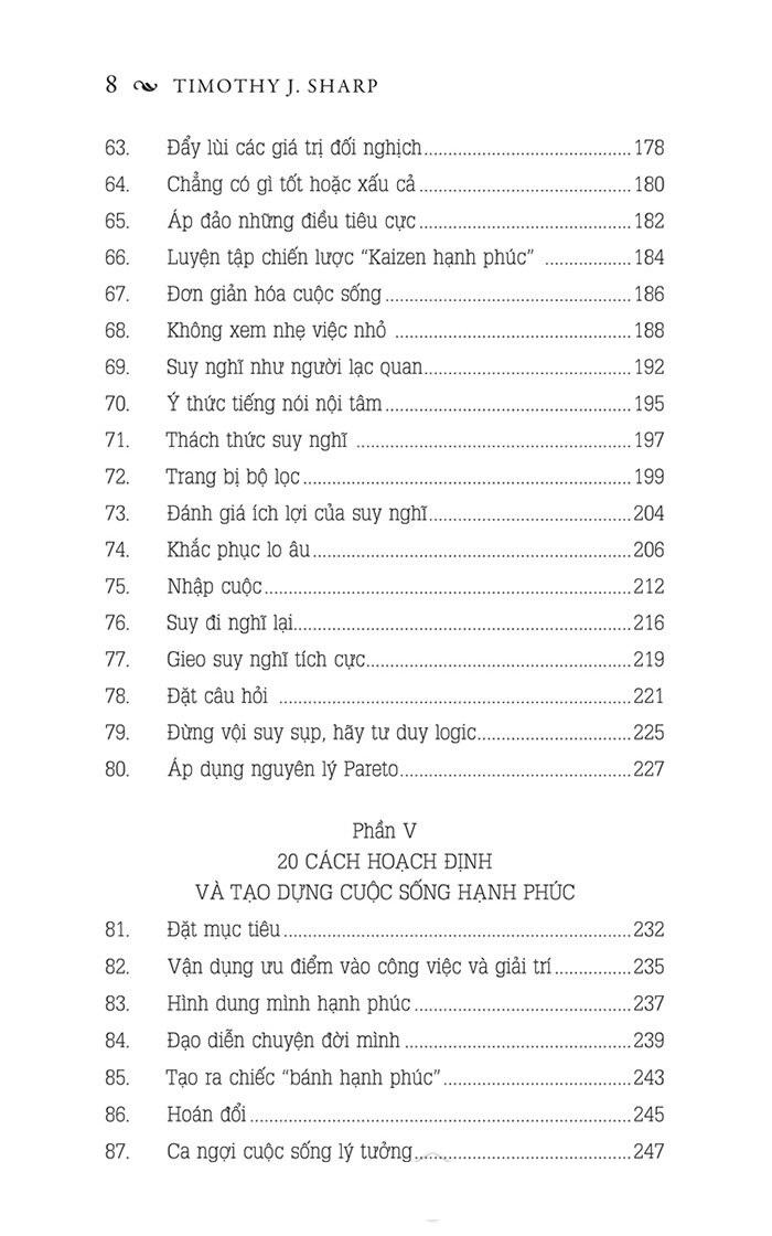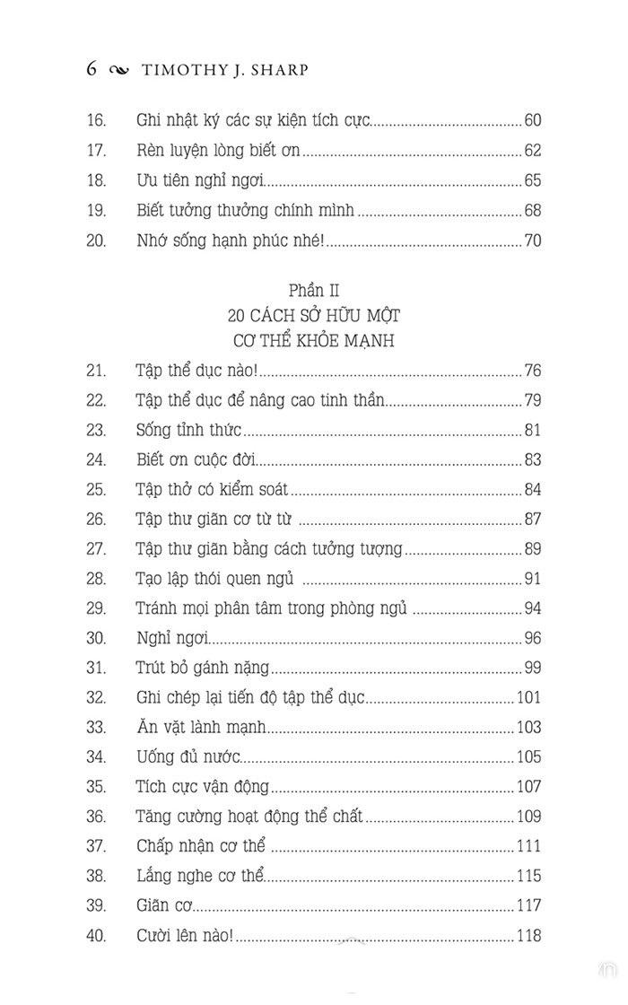 Bạn có hạnh phúc không? Khi bế tắc và xuống tinh thần, bạn có tự thuyết phục mình rằng, bạn không có đủ thời gian và năng lượng để theo đuổi một cuộc sống viên mãn? Hãy suy nghĩ lại đi! Trong quyển sách bổ ích và đầy cảm hứng này, Dr. Timothy J. Sharp chia sẽ 100 động cơ nâng đỡ tinh thần, có thể thực hành một cách nhẹ nhàng mỗi ngày và mang lại cho bạn những kết quả tốt đẹp, làm thay đổi cuộc đời về sau.