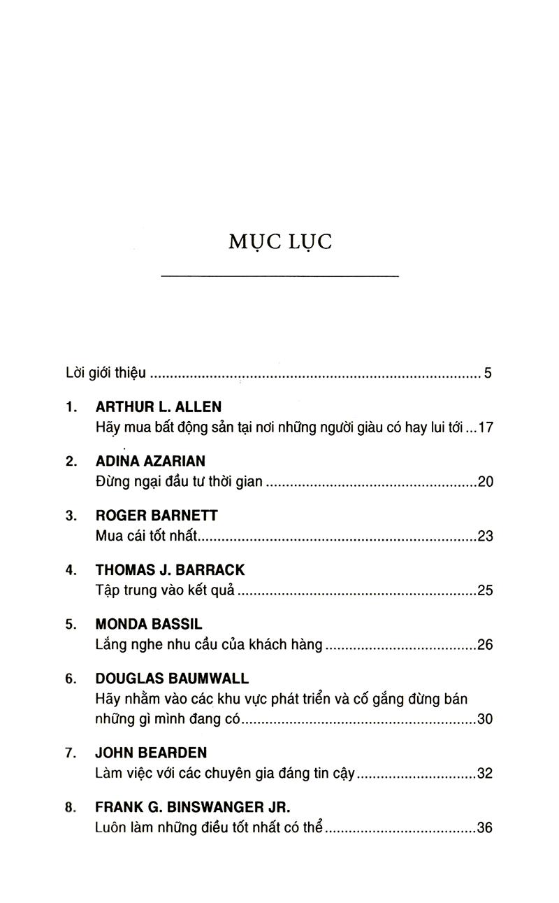 Trong cuốn sách này, bạn sẽ thấy sự sáng suốt khác thường có được là nhờ vào những kinh nghiệm và bài học mà những nhân vật có thế lực trong kinh doanh bất động sản trên khắp nước Mỹ phải trải bao khó khăn mới rút ra được. Có rất nhiều điều mà lẽ ra tất cả chúng ta đã có thể làm tốt hơn: từ việc bỏ lỡ cơ hội, dự đoán sai về thị trường đến việc thương lượng quá cao hoặc quá thấp. Những nhà kinh doanh này - cả nam lẫn nữ - sẽ kể cho bạn biết họ đã học được gì.