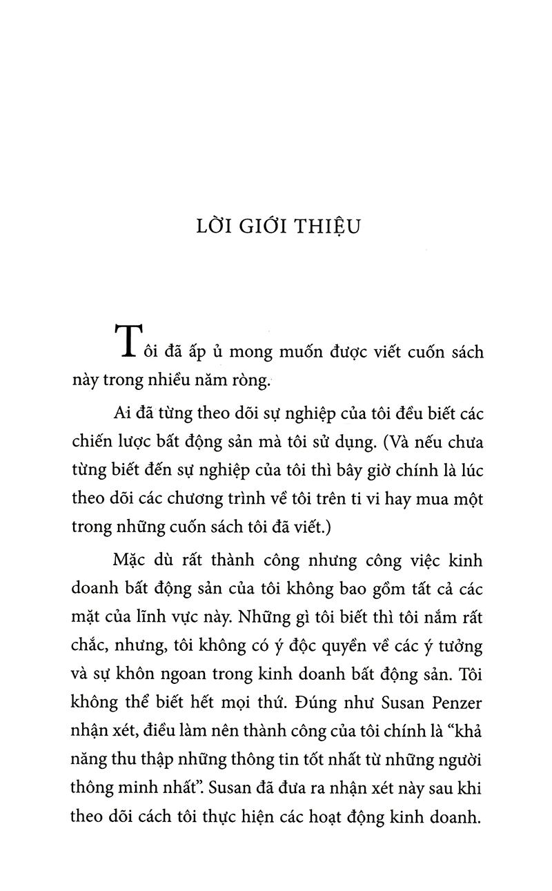 Susan đã đưa ra nhận xét này sau khi theo dõi cách tôi thực hiện các hoạt động kinh doanh. Và nhận xét đó cũng đúng với những gì tôi thực hiện trong cuốn sách này, đó là thu thập những thông tin hay nhất từ những người thông minh nhất trong lĩnh vực bất động sản. Họ chia sẻ những kinh nghiệm và những bài học mà họ đã học được từ người khác cũng như từ những sai lầm họ đã mắc.