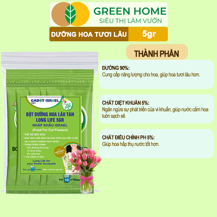 Dưỡng hoa tươi lâu longlife Greenhome, gói 5gr, lâu tàn, nở bông to, không bị hôi nước