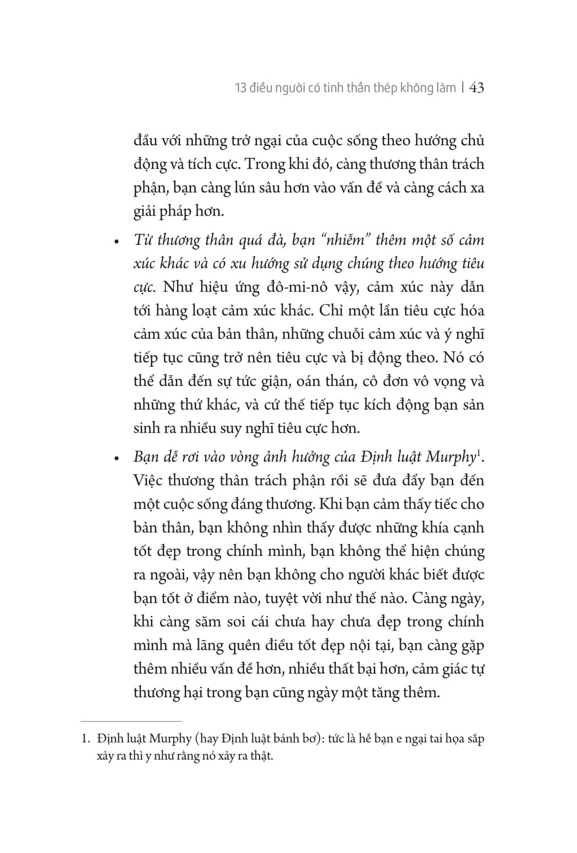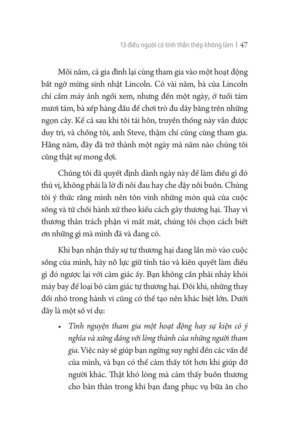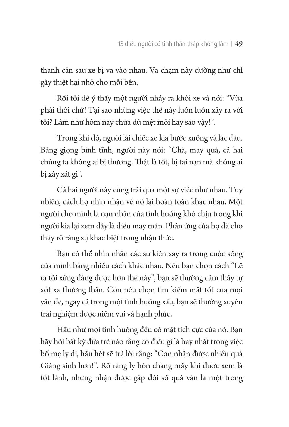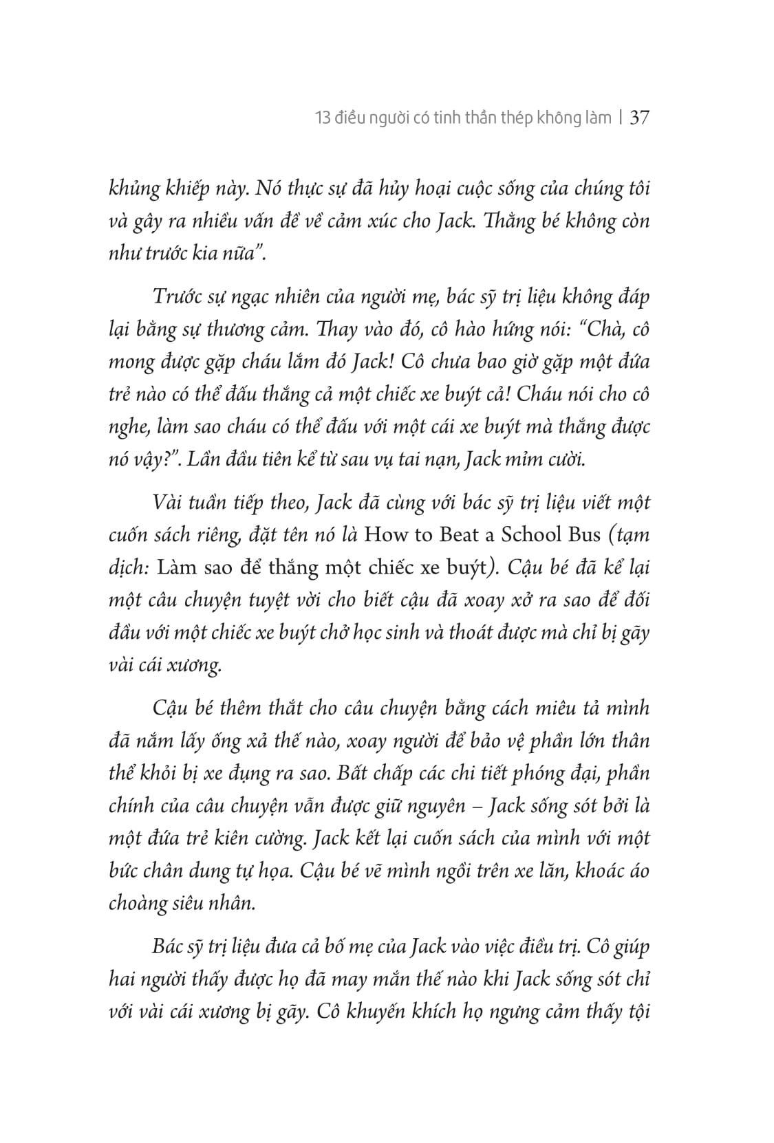 Tựa sách 13 điều người có tinh thần thép không làm gồm 13 chương, viết về 13 thói quen xấu đang kìm hãm mỗi người trong chúng ta khám phá và khai thác mọi đức tính và phẩm chất tốt trong chính mình.
