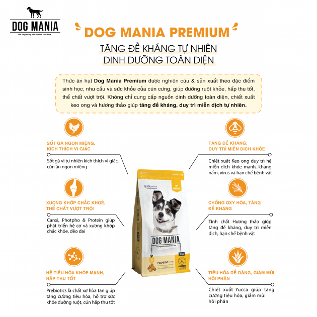 THỨC ĂN HẠT CHO CHÓ MỌI LỨA TUỔI DOG MANIA PREMIUM Thức ăn hạt dinh dưỡng cho chó Dog Mania Premium giúp hấp thu tốt, thể chất vượt trội. Không chỉ cung cấp nguồn dinh dưỡng toàn diện, chiết xuất keo ong và hương thảo giúp tăng đề kháng, duy trì miễn dịch tự nhiên. Sản phẩm phù hợp với chó mọi lứa tuổi. CÔNG DỤNG SẢN PHẨM Chiết xuất Keo ong là kháng sinh tự nhiên giúp duy trì nền tảng miễn dịch khỏe mạnh, đề kháng vượt trội, kháng nấm, virus và phòng ngừa bệnh khi giao mùa Tinh chất Hương thảo giúp tăng đề kháng, duy trì miễn dịch, hạn chế bệnh vặt Canxi, Photpho & Protein giúp phát triển hệ cơ và xương khớp chắc khỏe, dẻo dai Prebiotics là chất xơ hòa tan giúp tăng cường tiêu hóa, hỗ trợ sức khỏe đường ruột, cún hấp thu tốt Sốt gà vị tự nhiên kích thích vị giác, cún ăn ngon miệng Chiết xuất Yucca giúp tăng cường tiêu hóa, giảm mùi hôi phân PHÂN TÍCH GIÁ TRỊ DINH DƯỠNG Protein ≥ 22.0% Độ ẩm ≤ 12.0% Chất béo ≥ 12.0% Khoáng tổng số ≥ 10.0% Chất xơ ≤ 5.0% Canxi: 1.0 - 2.3% Photpho: 0.8 - 1.6%