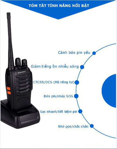 Thiết kế nhỏ gọn Motorola XPR-368 chịu được va đập rất tốt. Dải tần số UHF 400 – 470 MHz với khả năng xuyên phá vật cản rất tốt (rất phù hợp cho các tòa nhà cao tầng) Công suất phát 05 Watt giúp cho giọng nói chân thực, âm thanh rõ ràng, khả năng chống nhiễu tốt hơn, giữ công việc ổn định theo tiến độ. Sử dụng 16 nhóm kênh liên lạc cho phép bạn có thể liên lạc được với nhiều nhóm làm việc mà vẫn đảm bảo tính bảo mật. Phạm vi liên lạc cực kỳ tốt 800 – 2500 mét (theo địa hình thực tế) Dung lượng pin 1500mAh thời gian sử dụng liên tục lên đến 12 giờ Giọng nói nhắc khi pin yếu Tích hợp đèn chiếu sáng và nháy SOS khẩn cấp Trọn bộ sản phẩm: 2 x (Thân máy, pin, sạc, ăngten, dây đeo, bát cài lưng, tai nghe, hộp bảo vệ, sách hướng dẫn sử dụng) Luôn có sẵn các phụ kiện: Pin, sạc, ăngten, tai nghe để mình thay thế hoặc nâng cấp khi cần. Lưu ý: Nếu mình chưa dùng và mua mới thì dùng tối thiểu là 2 bộ để liên lạc, và tùy theo số lượng người dùng mình sẽ mua theo số lượng tương ứng.