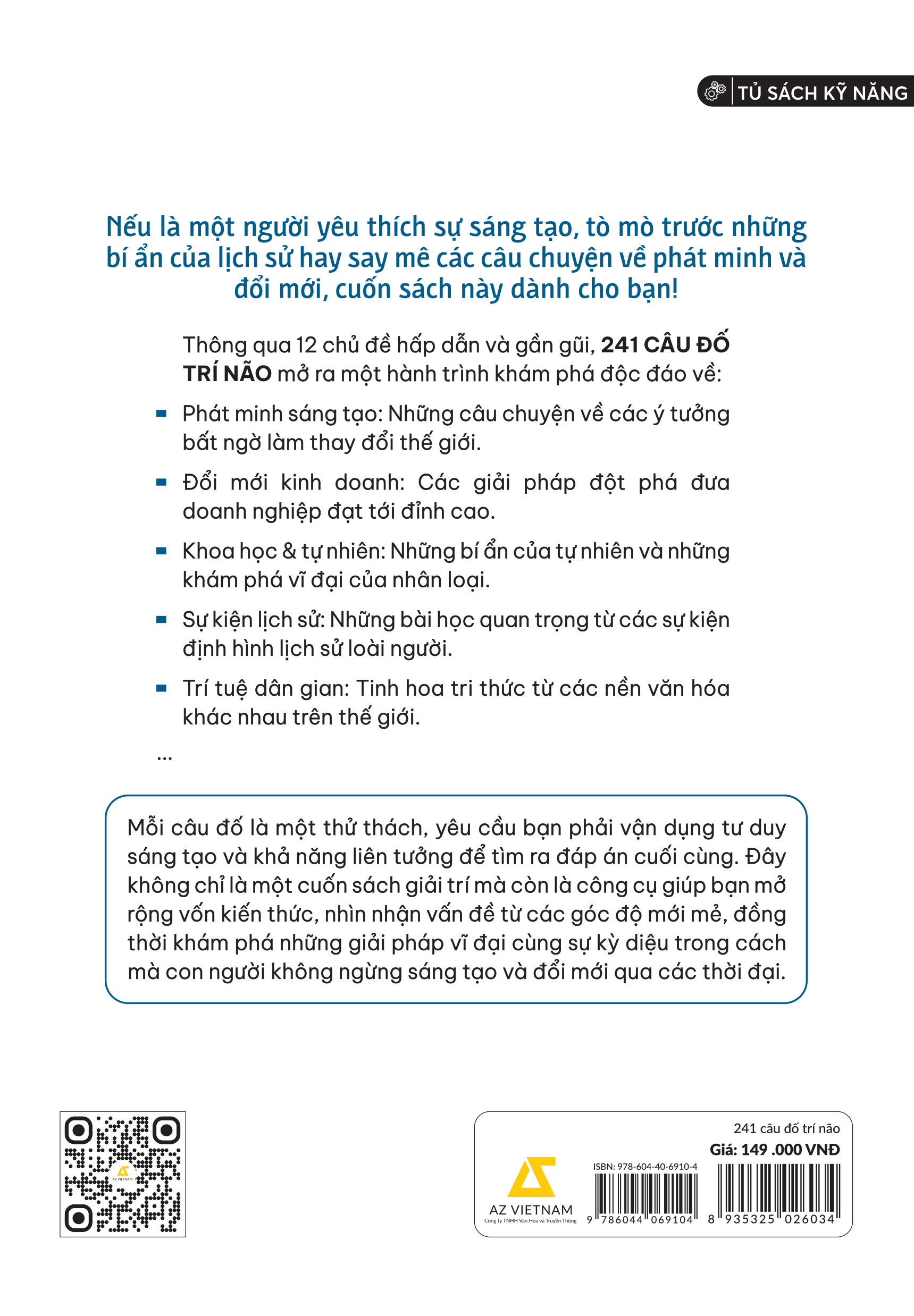 Mua tại TiktokNếu là một người yêu thích sự sáng tạo, tò mò trước những bí ẩn của lịch sử hay say mê các câu chuyện về phát minh và đổi mới, cuốn sách này dành cho bạn! Thông qua 12 chủ đề hấp dẫn và gần gũi, 241 CÂU ĐỐ TRÍ NÃO mở ra một hành trình khám phá độc đáo về: