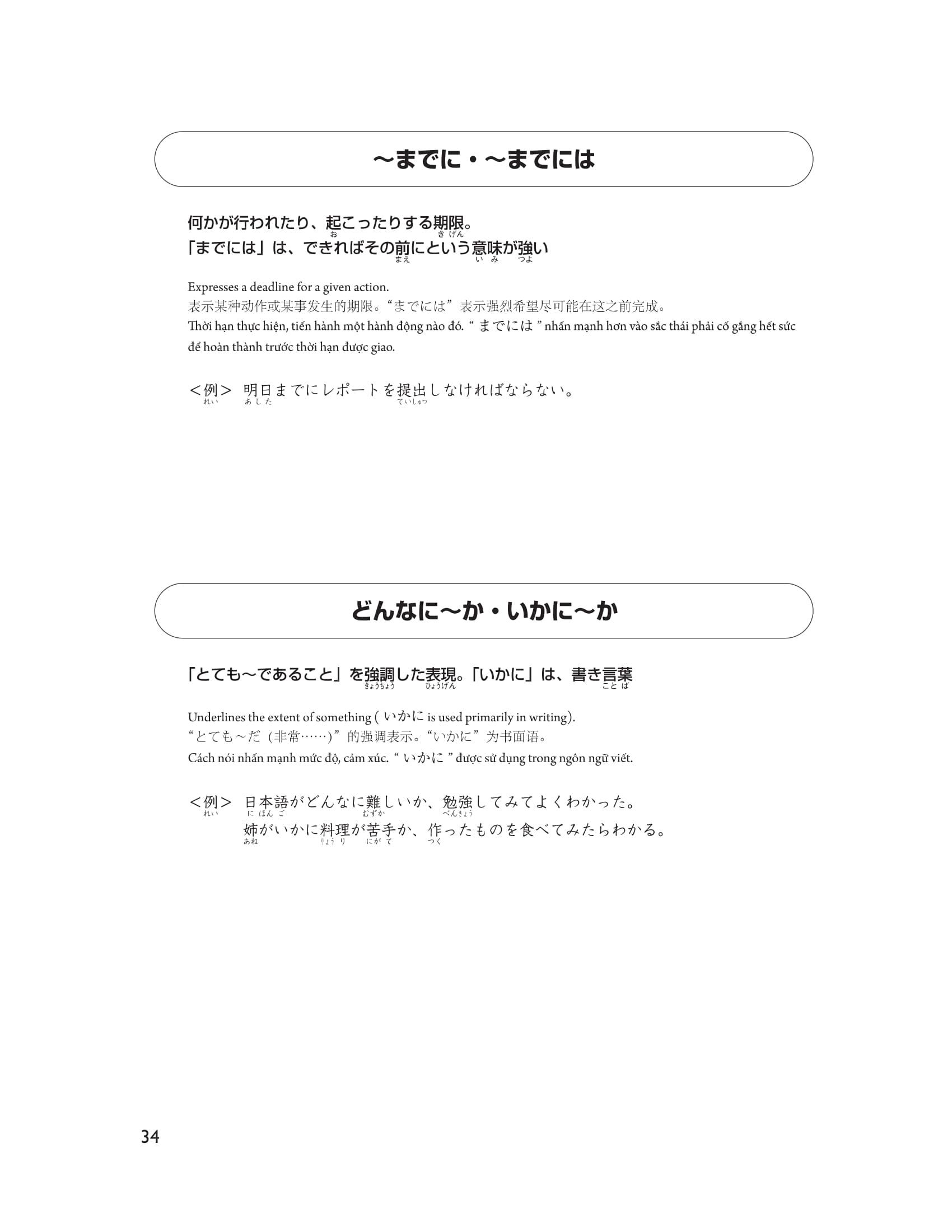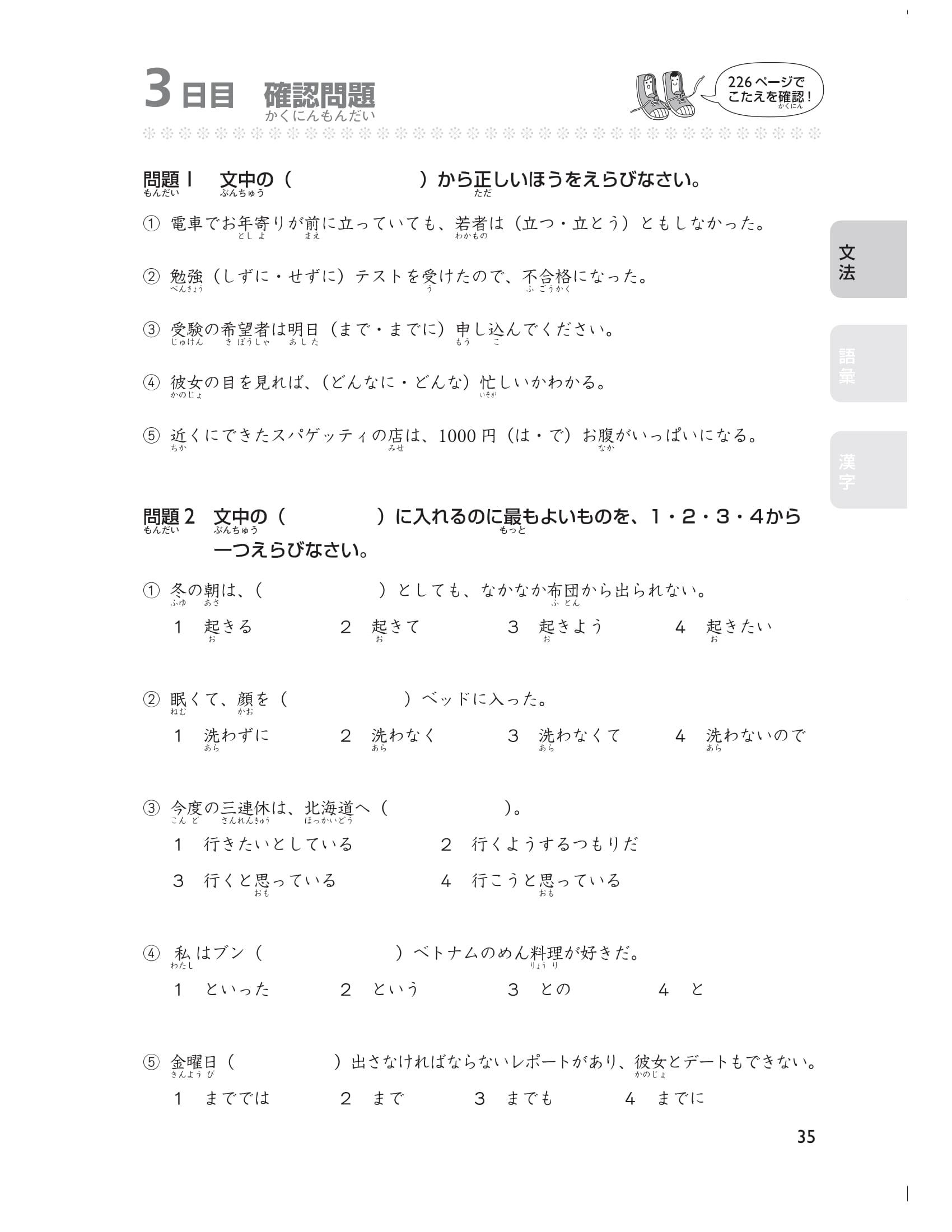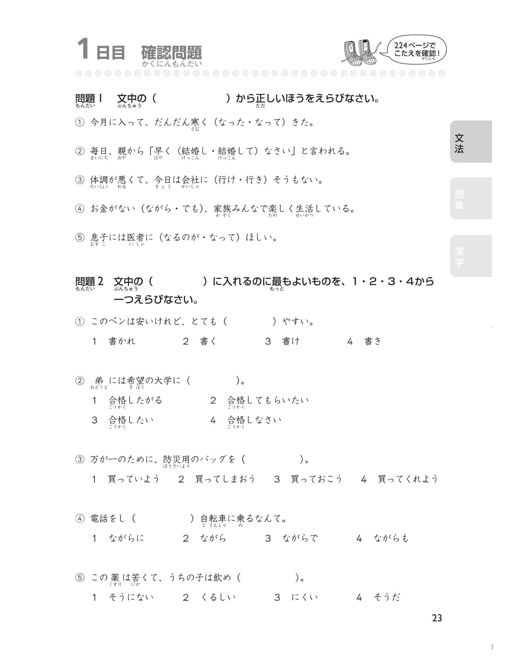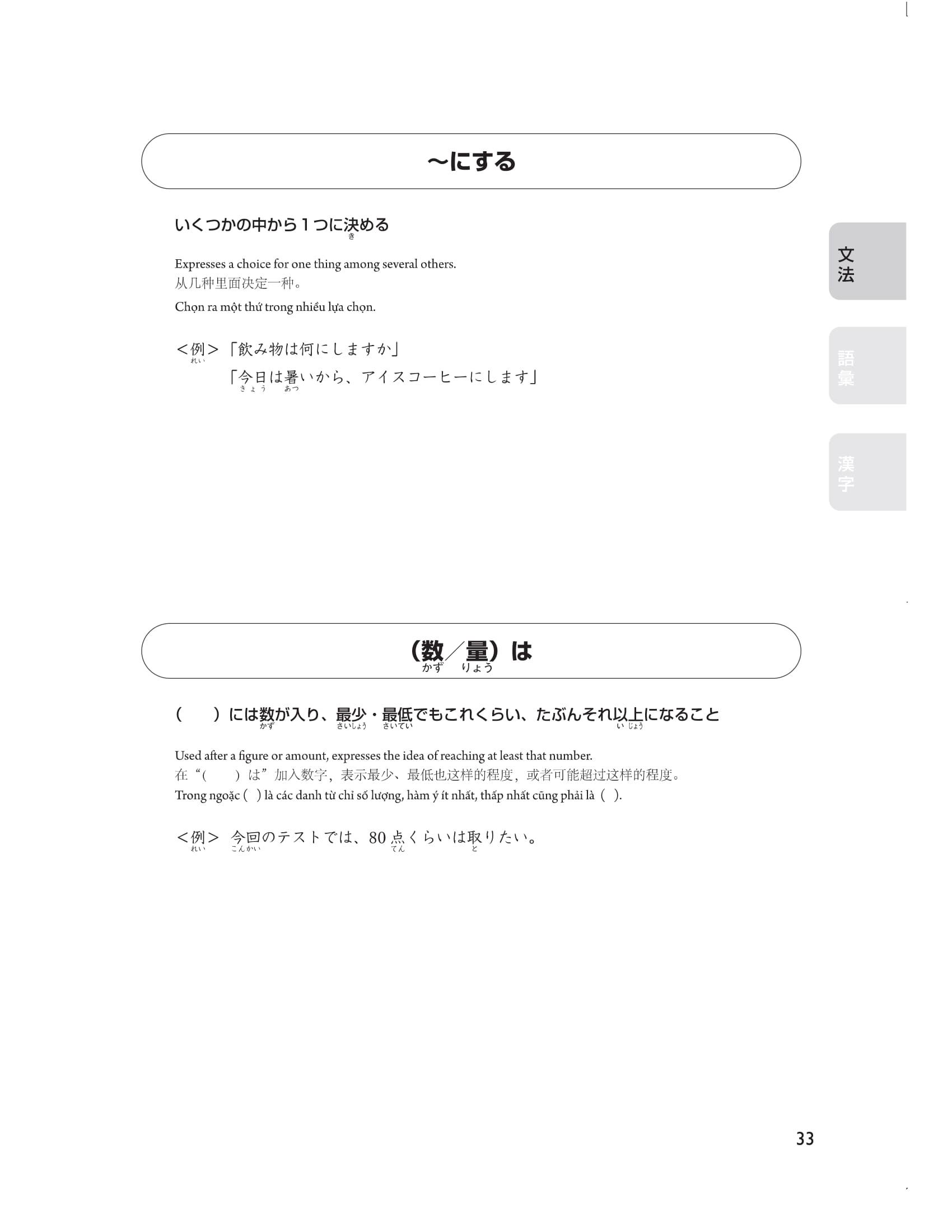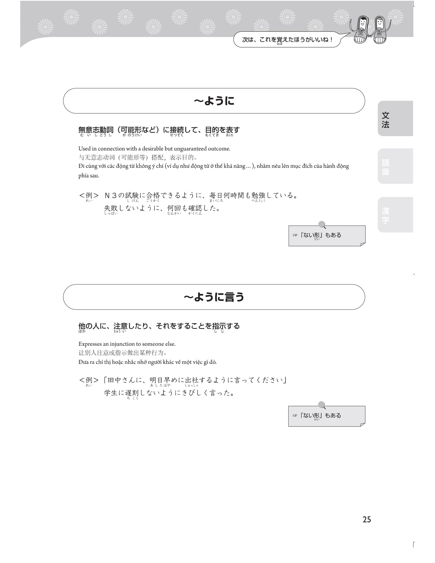 Để các bạn có thể luyện tập hiệu quả, ngoại trừ các chữ Hán thuộc cấp độ N5 thì tất cả các chữ Hán khác đều có furigana đi kèm nên các bạn vừa có thể kiểm tra được cách đọc của chữ Hán vừa có thể tăng tốc trong việc học. Sau khi nắm vững được các kiến thức trong cuốn sách này, các bạn hãy kiểm tra năng lực đọc hiểu của mình và phát huy khả năng đó trong phần thi nghe hiểu ở bài thi thật.