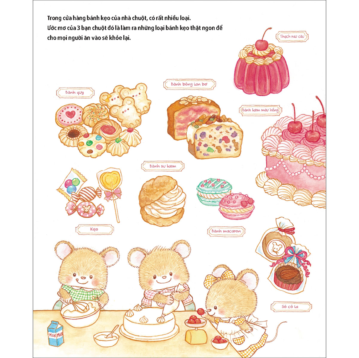 Câu chuyện kể về một cửa hàng bánh kẹo nằm sâu bên trong rừng, nơi có ba bạn chuột hằng ngày làm ra những món đồ ngọt thơm lừng giúp khách hàng nhoẻn miệng cười. Tại cửa hàng này, vị khách nào sở hữu chiếc chìa khóa bí mật sẽ được các bạn chuột làm tặng món bánh kẹo tùy thích. “Hãy ngon lên nhé! Hãy ngon lên nhé!” các bạn chuột luôn tràn đầy nhiệt huyết và luôn dành toàn bộ tâm tư, tình cảm để chăm chút cho từng chiếc bánh.