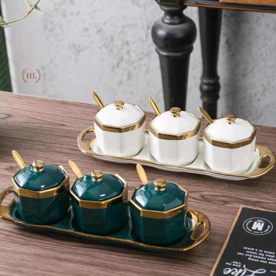 ✨3 Hũ đựng gia vị chất liệu sứ kẻ viền vàng kèm thìa Inox có khay hứng dáng lục giác 2022 | GIA VỊ SỨ LỤC NĂNG XANH TRẮNG