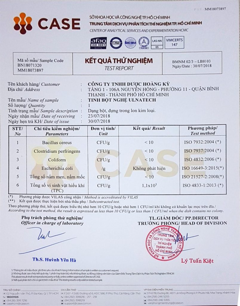 TINH NGHỆ ULNATECH Thành phần: - 100% tinh bột nghệ đỏ An Bình. - Nano Curcummin: 40.000mg/kg Hàm lượng Curcumin: 40.000mg/kg (gấp 4 lần tinh bột nghệ đỏ thông thường). Màu sắc: Vàng cam. Xuất