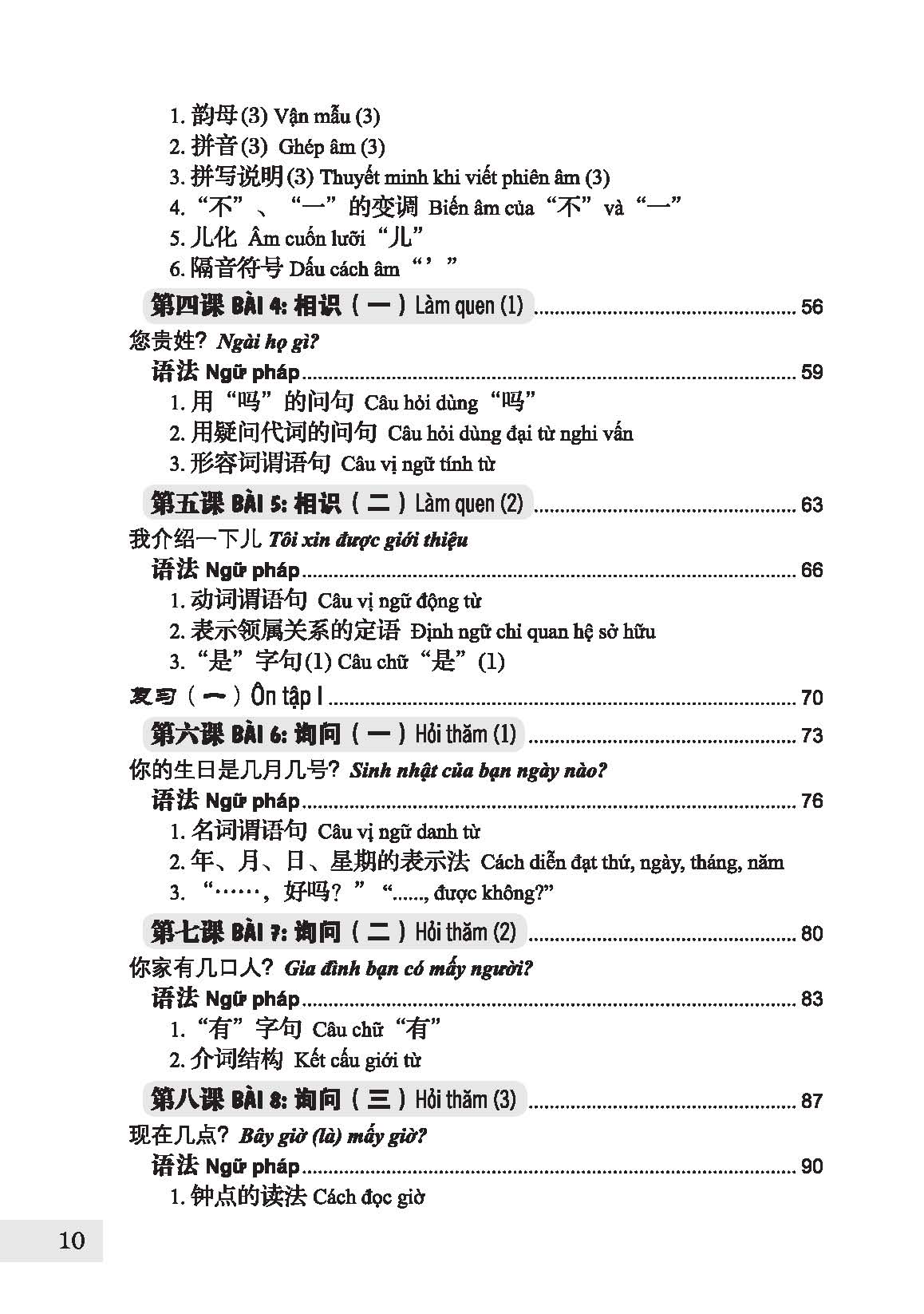 Để giúp người học khắc phục khó khăn nói trên, trong lần dịch lại cuốn sách này, ngoài việc tôn trọng nguyên vẹn nội dung của tài liệu gốc, chúng tôi có thêm một phần giới thiệu ngữ âm tiếng Hoa, chữ Hoa. Sau mỗi bài, chúng tôi bổ sung thêm một bài tập viết các chữ Hoa mới xuất hiện trong bài. Ngoài ra, ở mỗi bài Ôn tập, chúng tôi có thêm phần “Góc kiến thức”, cuối sách là các phụ lục cung cấp một số thông tin hữu ích cho người học như: bộ thủ, tên các tỉnh, thành phố và một số họ thông thường của Việt Nam và Trung Quốc. Những thông tin này sẽ giúp người học vừa có thêm kiến thức vừa tăng thêm hứng thú học tập