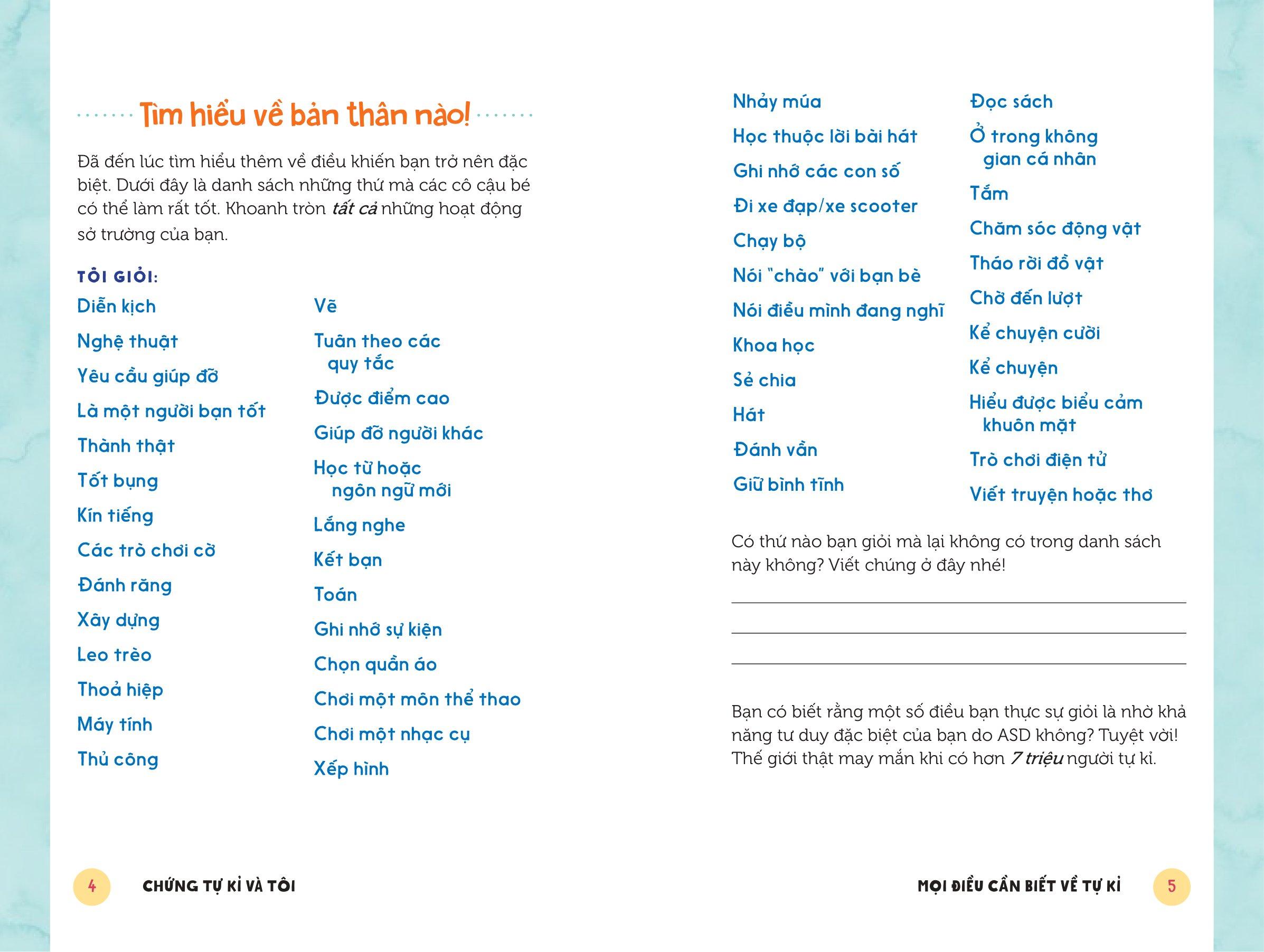 Khác Biệt Cũng Là Điều Bình Thường - Chứng Tự Kỉ Và Tôi bao gồm 35 bài tập và câu hỏi tương tác nhằm giúp những trẻ mắc chứng tự kỉ có được sự tự tin và những kĩ năng cần thiết để hội nhập với thế giới xung quanh. Những hoạt động vui vẻ này cũng giúp trẻ có thể hiểu chứng tự kỉ rõ hơn, đồng thời học cách đón nhận một vài khía cạnh tự kỉ có thế mạnh.
