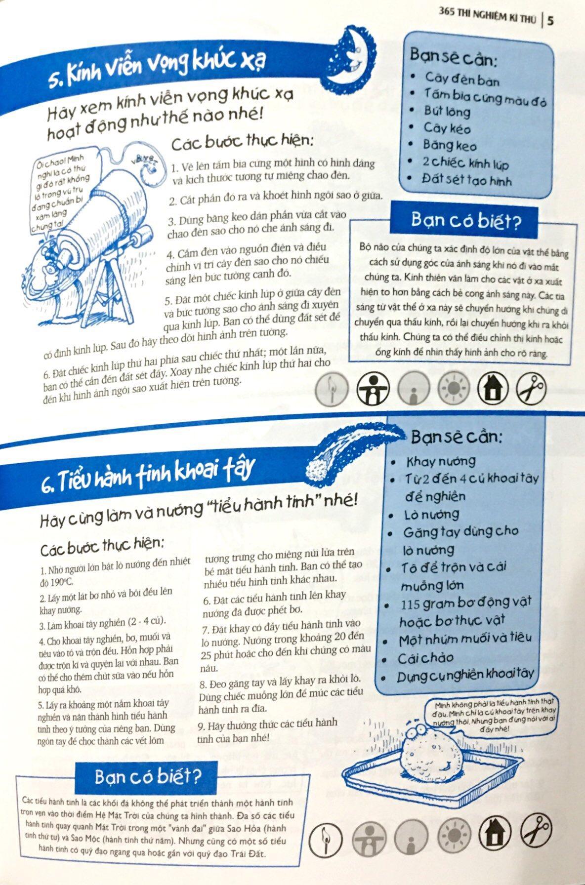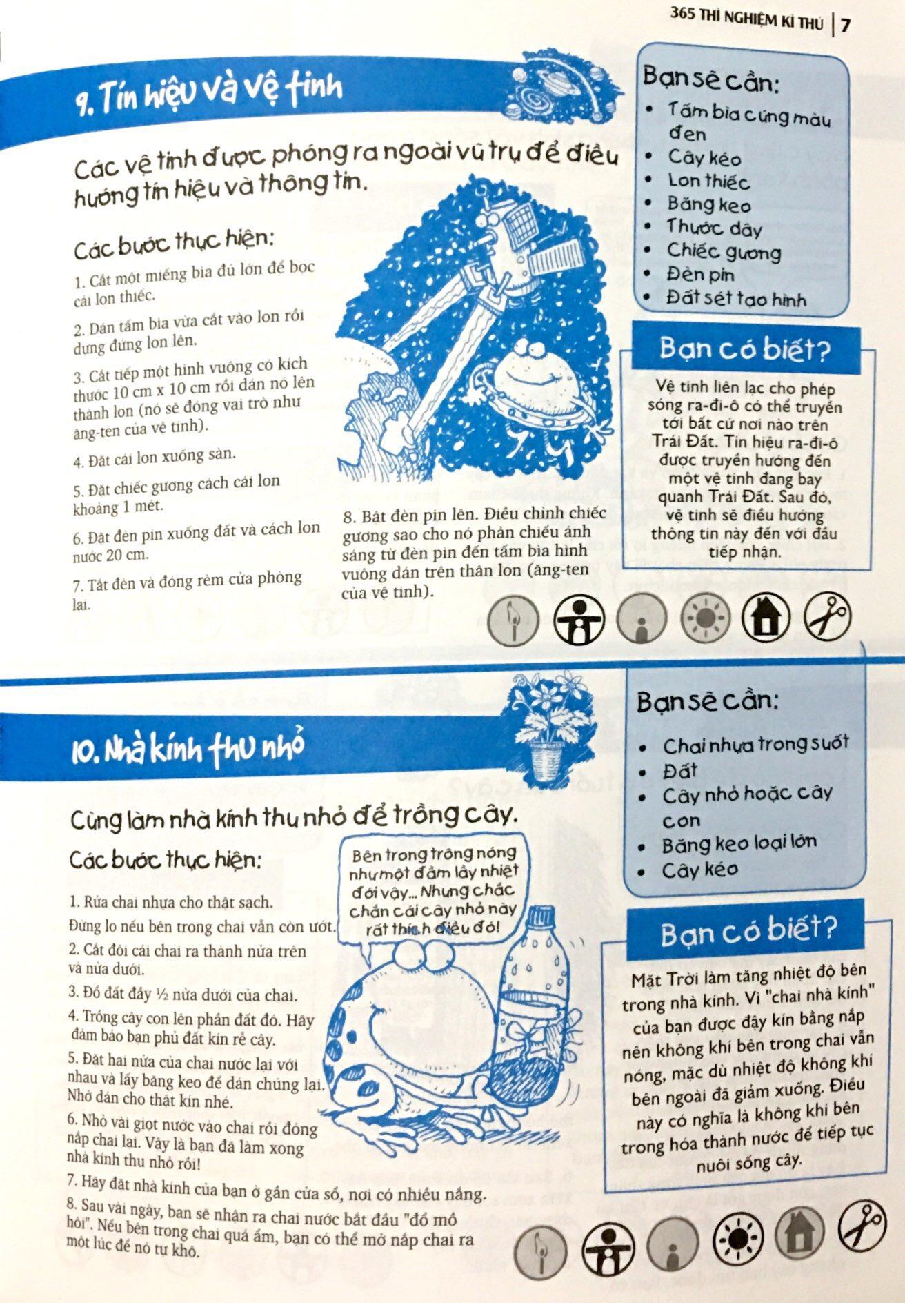 Sẽ thú vị thế nào khi bé nhà bạn có thể trải nghiệm cảm giác mặc thử bộ đồ phi hành gia? Sẽ ra sao nếu bé hình dung được màu sắc của sao Hỏa, biết được lực li tâm là gì và nó xuất hiện khi nào, chính mắt nhìn thấy quả cà tím trồng trong nhà “chảy mồ hôi”, hay hiểu được sự khác biệt của túi tự phân hủy và túi nhựa để từ đó biết cách bảo vệ môi trường hơn? và còn vô vàn những khám phá thú vị khác từ các thí nghiệm trong “365 thí nghiệm kì thú”.