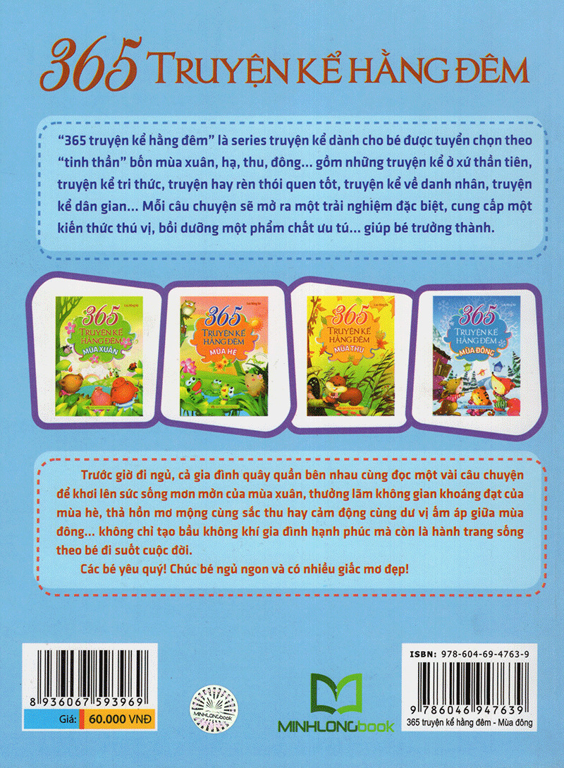 365 truyện kể hàng đêm là series truyện kể dành cho bé được tuyển chọn theo “tinh thần” bốn mùa xuân, hạ, thu, đông… gồm những truyện kể ở xứ thần tiên, truyện kể tri thức, truyện hay rèn thói quen tốt, truyện kể về danh nhân, truyện kể dân gian… Mỗi câu chuyện sẽ mở ra một trải nghiệm đặc biệt, cung cấp một kiến thức thú vị, bồi dưỡng một phẩm chất ưu tú giúp bé trưởng thành.