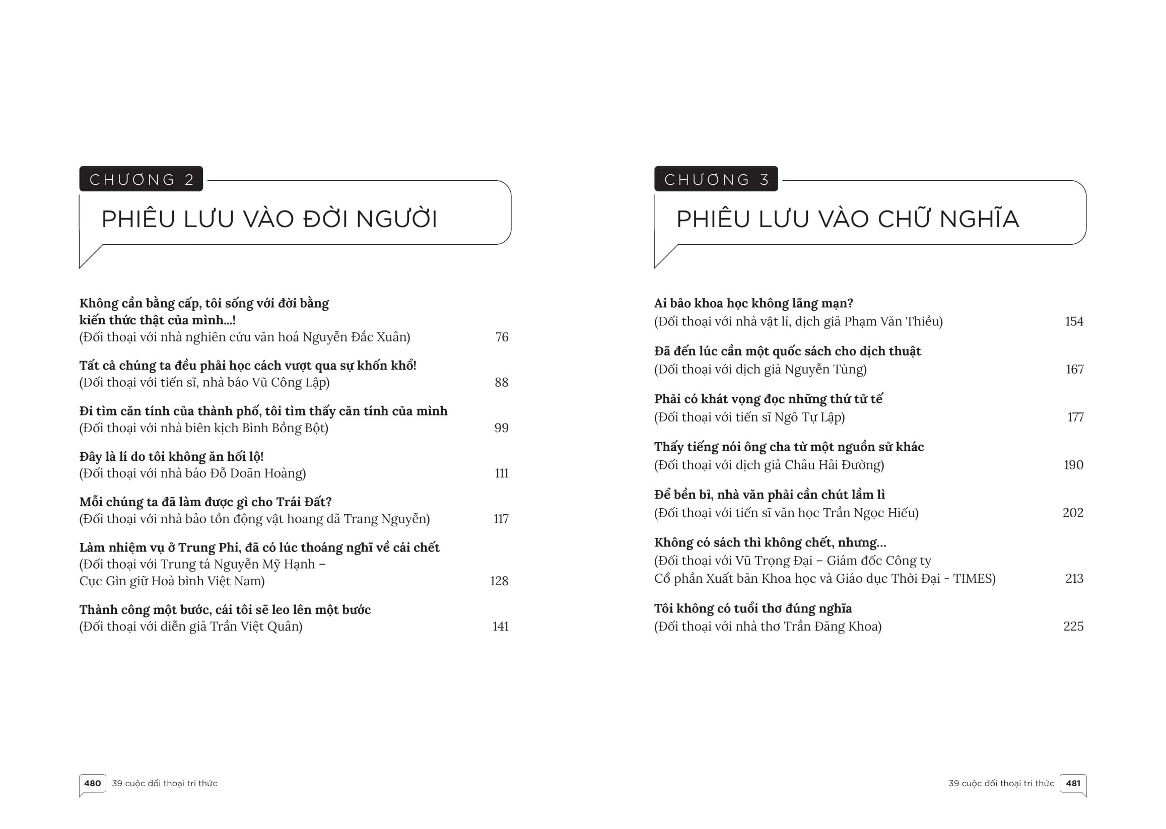 39 Cuộc Đối Thoại Tri Thức mang đến 39 miền phiêu lưu như thế. Qua 39 cuộc phiêu lưu trong tâm trí của 39 trí thức tới từ nhiều lĩnh vực khác nhau, bạn đọc sẽ phát hiện những “vỉa quặng tri thức” giá trị, góp phần làm giàu thêm cho vốn sống, trải nghiệm, gợi mở tư duy, để trong một khoảnh khắc tương lai nào đó, khi suy ngẫm lại, bạn sửng sốt nhận ra góc nhìn mới mẻ từ những điều m.ình thu nhận được.
