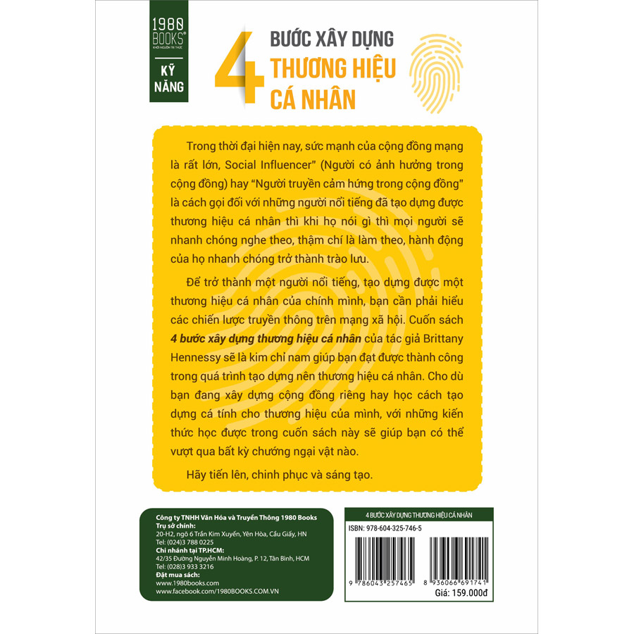- Loại 3: Các nhãn hiệu đã bắt đầu tiếp cận bạn bởi hoặc là bạn có rất nhiều lượt theo dõi, hoặc bạn có một cuộc sống khá là thú vị. Có thể bạn là chuyên gia trong lĩnh vực của mình, bạn đã tạo nên một công ty/ hoặc sản phẩm, hoặc bạn là một vũ công/ nhạc sĩ/ người mẫu/ diễn viên. Dù là gì, khi bạn nói, mọi người sẽ lắng nghe và đó chính là truyền cảm hứng. Phần 3 “Kiếm tiền từ ảnh hưởng của bạn” sẽ đi sâu vào chi phí đàm phán, hiểu rõ về bản hợp đồng, và tìm người đại diện. Trong cuộc sống, bạn thường xuyên được hỏi về kế hoạch 5 năm của mình, và nó sẽ không thay đổi khi bạn trở thành một người sáng tạo nội dung. Dù bạn đang ở phân đoạn nào đi chăng nữa. Phần 4: “Lên kế hoạch cho tương lai” sẽ giúp bạn biến khách hàng mới thành khách hàng thân quen, và biến từ một chương trình đơn lẻ thành đại sứ thương hiệu. Cuốn sách “4 bước xây dựng thương hiệu cá nhân”của tác giả Brittany Hennessy sẽ là kim chỉ nam giúp bạn đạt được thành công trong quá trình tạo dựng nên thương hiệu cá nhân. Cho dù bạn đang xây dựng cộng đồng riêng hay học cách tạo dựng cá tính cho thương hiệu của mình, với những kiến thức học được trong cuốn sách này sẽ giúp bạn có thể vượt qua bất kỳ chướng ngại vật nào. Hãy tiến lên, chinh phục và sáng tạo!