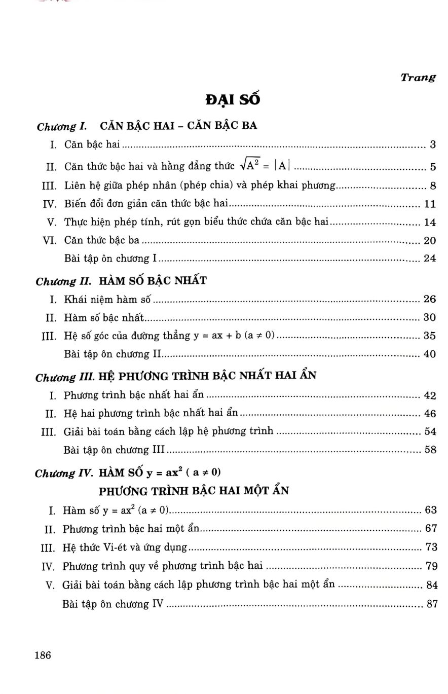 - Khái niệm hàm số II. Hàm số bậc nhất. III. Hệ số góc của đường thẳng y = ax + b (a ≠ 0). Bài tập ôn chương II... Chương III. HỆ PHƯƠNG TRÌNH BẬC NHẤT HAI ẨN I. Phương trình bậc nhất hai ẩn II. Hệ hai phương trình bậc nhất hai ẩn... III. Giải bài toán bằng cách lập hệ phương trình Bài tập ôn chương III Chương IV. HÀM SỐ y = ax2 (a ≠ 0) PHƯƠNG TRÌNH BẬC HAI MỘT ẨN I. Hàm số y = ax2 (a ≠ 0) II. Phương trình bậc hai một ẩn. III. Hệ thức Vi-ét và ứng dụng. IV. Phương trình quy về phương trình bậc hai V. Giải bài toán bằng cách lập phương trình bậc hai một ẩn Bài tập ôn chương IV HÌNH HỌC Chương I. HỆ THỨC LƯỢNG TRONG TAM GIÁC VUÔNG. Chương II. ĐƯỜNG TRÒN I. Định nghĩa đường tròn và tính chất đối xứng của đường tròn II. Vị trí tương đối của một điểm, một đường thẳng với đường tròn. Tiếp tuyến của đường tròn III. Vị trí tương đối của hai đường tròn. Chương III. GÓC VỚI ĐƯỜNG TRÒN I. Góc ở tâm và góc nội tiếp, cung chứa góc. II. Góc tạo bởi tia tiếp tuyến và cát tuyến. Góc có đỉnh ở bên trong và góc có đỉnh ở bên ngoài đường tròn.... III. Tứ giác nội tiếp. Đường tròn nội tiếp. Đường tròn ngoại tiếp IV. Độ dài đường tròn. Diện tích hình tròn. Chương IV. HÌNH TRỤ, HÌNH NÓN, HÌNH CẦU BÀI TẬP ÔN TẬP CUỐI NĂM Công ty phát hành: Nhà Sách Hồng Ân Năm Xuất Bản: 2025 Kích Thước: 17x24 cm Số Trang: 181 Nhà Xuất bản: Đại Học Sư Phạm Bìa: Mềm Tác Giả: TS. VŨ THẾ HỰU - NGUYỄN VĨNH CẬN
