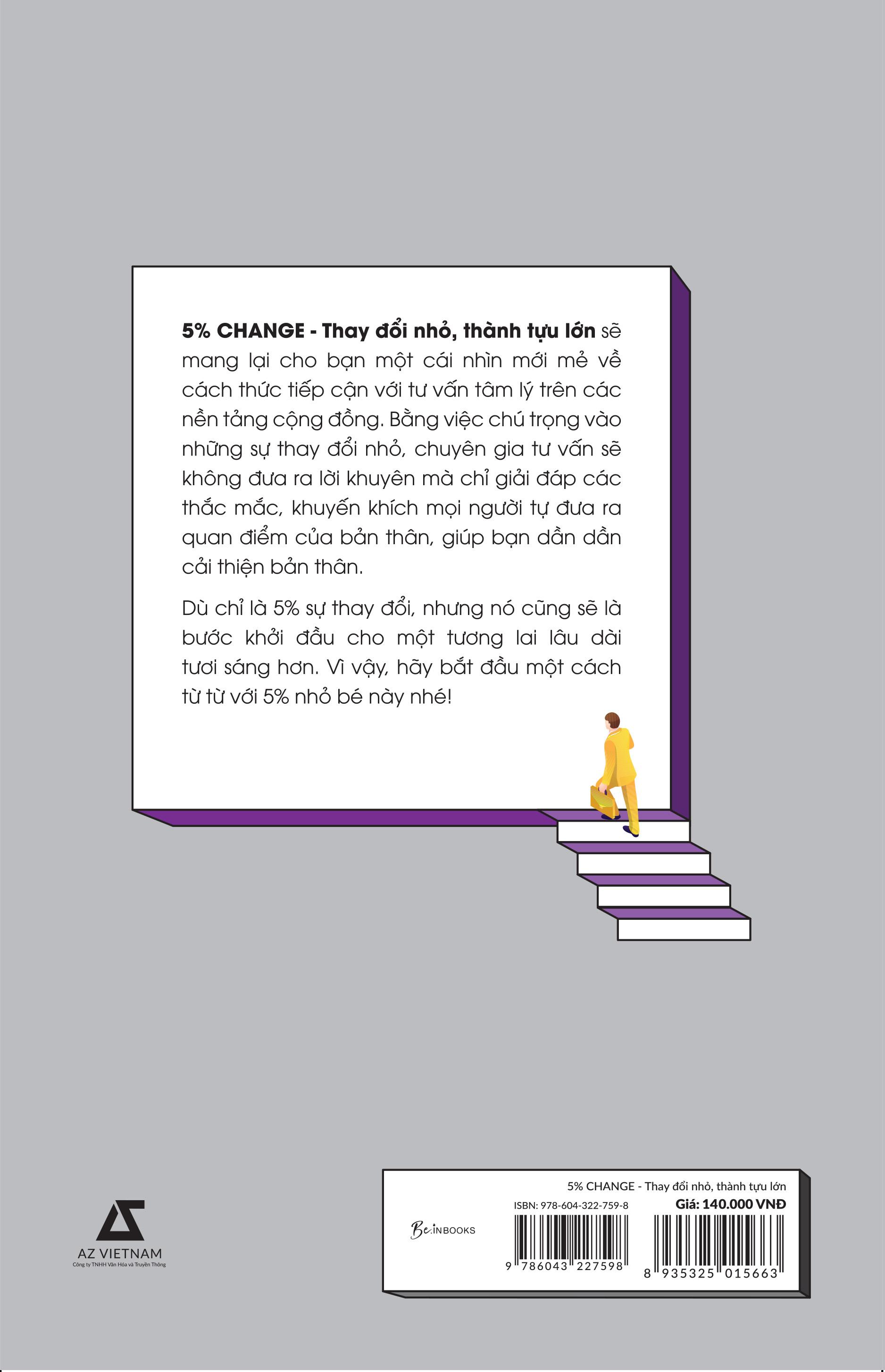 Mua tại Tiktok5% Change - Thay Đổi Nhỏ, Thành Tựu Lớn 5% CHANGE - THAY ĐỔI NHỎ, THÀNH TỰU LỚN: “HƯỚNG DẪN TỰ TRỢ GIÚP” HỮU ÍCH CHO NHỮNG AI CÓ KHÚC MẮC TÂM LÝ CẦN ĐƯỢC GIẢI QUYẾT