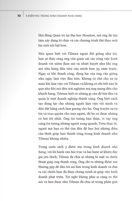 Cuốn sách là bản đúc kết những kinh nghiệm lãnh đạo doanh nghiệp quý giá cũng như cách thức điều hành nhà hàng của Tilman Fertitta - “chủ nhà hảng giàu có nhất trên thế giới” (theo Forbes). Với hãng chục năm kinh nghiệm trong nền công nghiệp nhà hàng, khách sạn, giải trí và cờ bạc, tác giả đã chỉ ra năm điểm mù có thể giết chết doanh nghiệp nhưng thường bị các nhà quản lý bỏ qua, đó là: