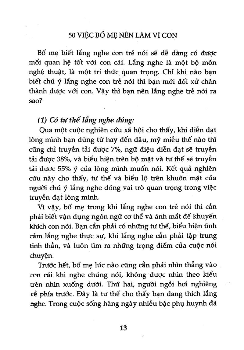 Nhiều bậc phụ huynh thắc mắc không biết mình nên làm gì? Và cuốn sách này chính là câu trả lời hay nhất. Con trẻ cần gì ở bố mẹ? Đó là một thế giới bình yên, cần được rèn luyện thói quen tốt đẹp, cần được học hỏi tri thức và học cách trải nghiệm cuộc sống… Những điều ấy không thể tách khỏi sự giáo dục của bố mẹ. Cuốn sách này đã đúc rút ra 50 việc bố mẹ cần làm vì con trong cuộc sống hàng ngày. Tuy chỉ là những việc nhỏ, nhưng chính những việc ấy lại dạy con thành người có chí, thành tài trong tương lai.