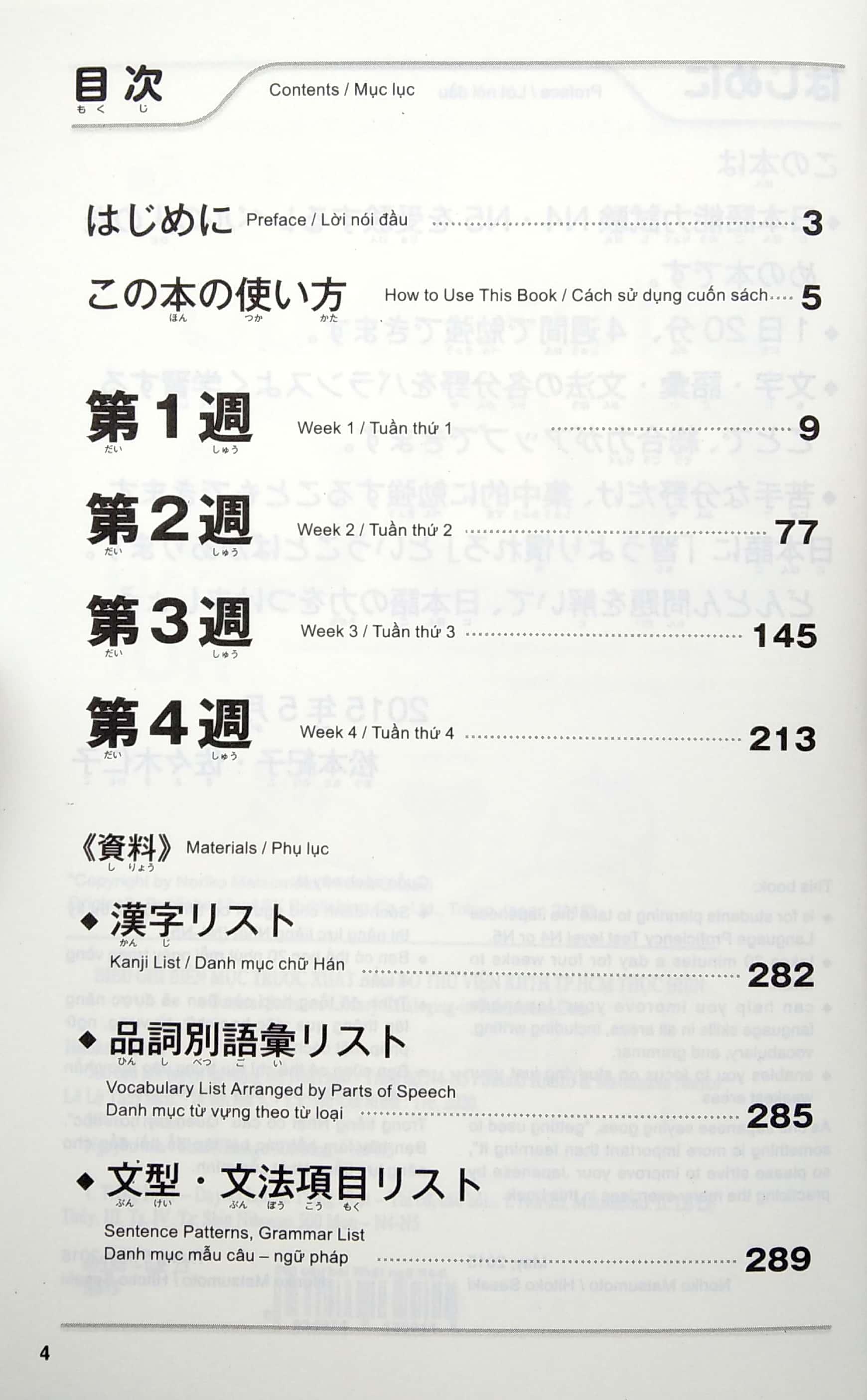 Điểm đặc biệt là sách được thiết kế theo ngày, mỗi ngày người học có thể ôn cả 3 kỹ năng : Từ vựng, Ngữ pháp, Hán tự chỉ với 15 phút. · Khổ sách