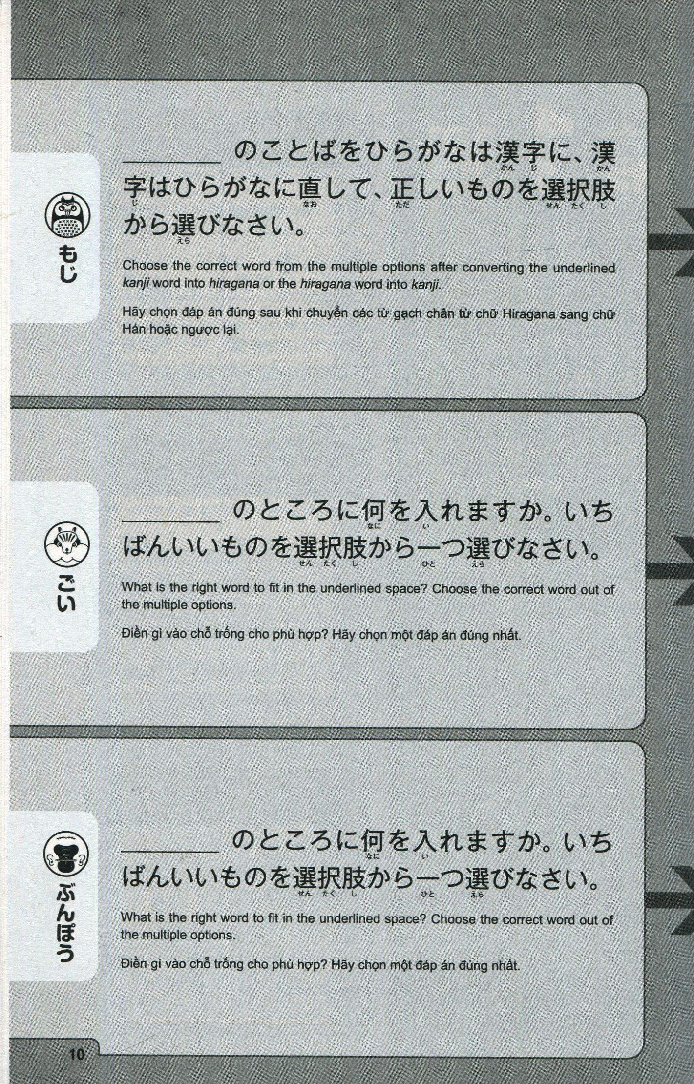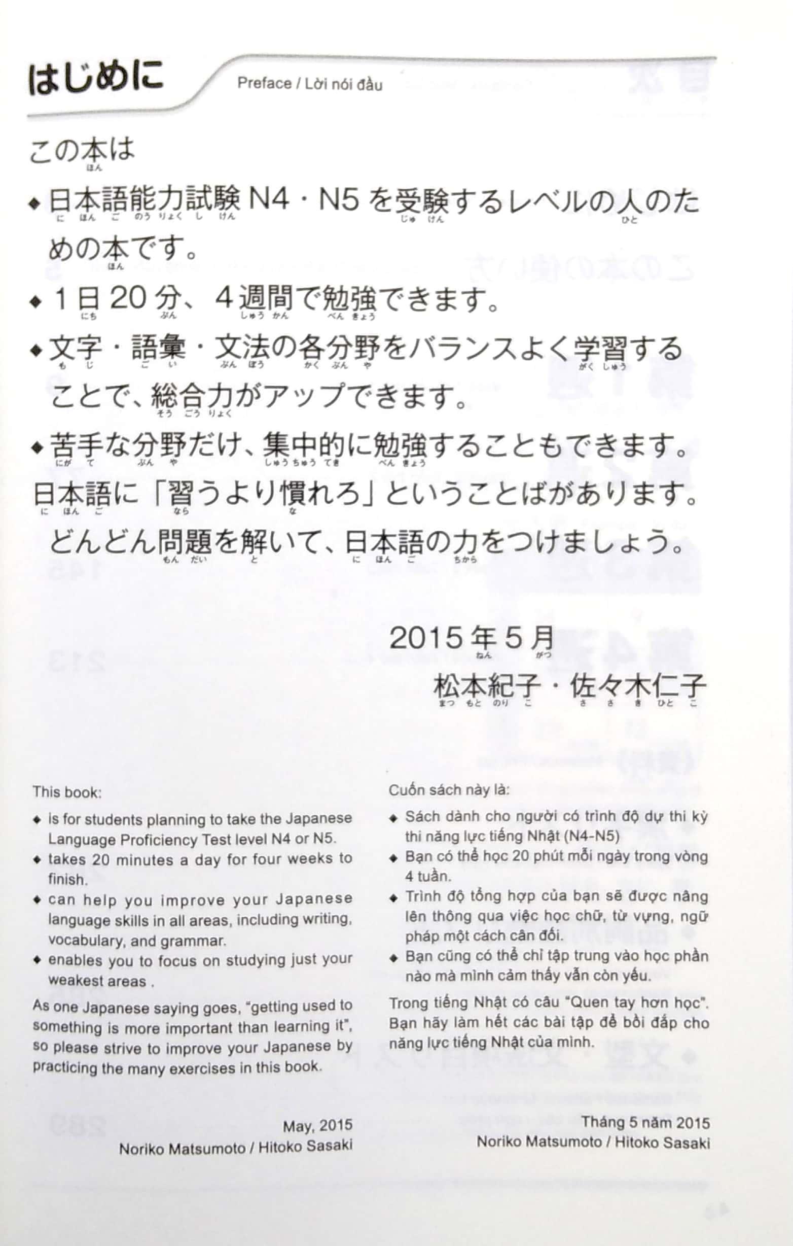 Bộ sách gồm 2 quyển: "Hán tự (Kanji) - Từ vựng (Goi)" và "Đọc hiểu (Dokkai) - Nghe hiểu (Choukai) - Ngữ pháp (Bunpou)" Đây là một tựa sách học tiếng Nhật hàng đầu trong