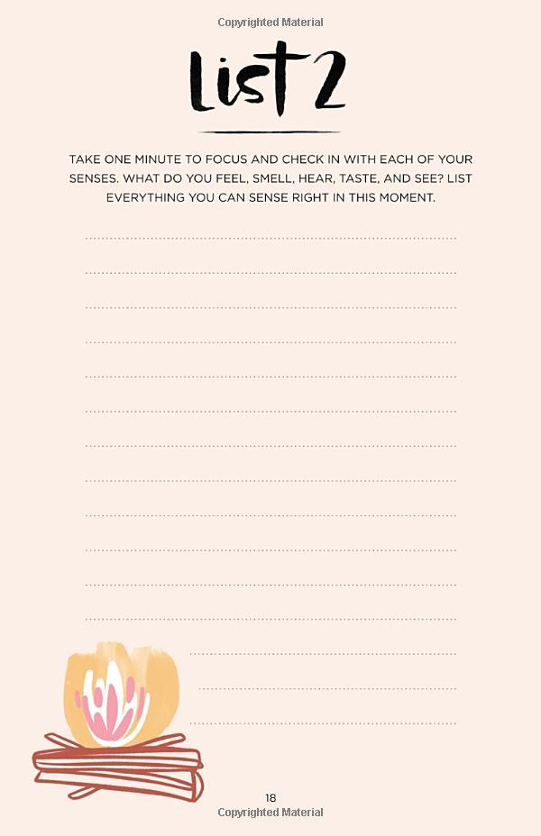 Develop peace of mind and serenity through the calming practice of list-making. Create 52 lists, one for each week of the year, in this lovely undated hardback journal, and along the way, develop a personalized tool kit at the back of the book as a quick reference with strategies to turn to for relief. Includes 52 listing prompts divided into 4 sections: Be Present, Look Back, Move Forward, and Release, plus tips and strategies for mindfulness and relaxation, thought-provoking quotes, short inspiring essays, soothing photography and illustrations, metallic-foil accents, and a ribbon. Those suffering from anxiety, tension, and burnout will find the journal particularly helpful, although anyone can benefit.