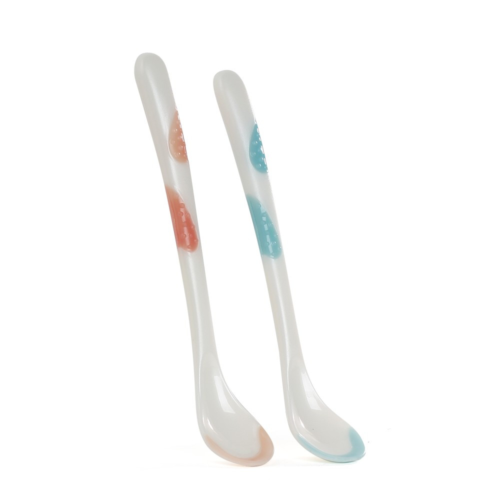 • Khi nhiệt độ cao, cơ chế cảnh báo nóng sẽ xuất hiện trên muỗng : phần viền màu xanh ( hoặc hồng) của muỗng sẽ chuyển sang màu nhạt khi tiếp xúc với thức ăn quá nóng, báo hiệu nhiệt độ chưa thích hợp để bé ăn. Điều này sẽ giảm thiểu được việc làm phỏng khuôn miệng, làn da nhạy cảm của bé khi cho bé ăn