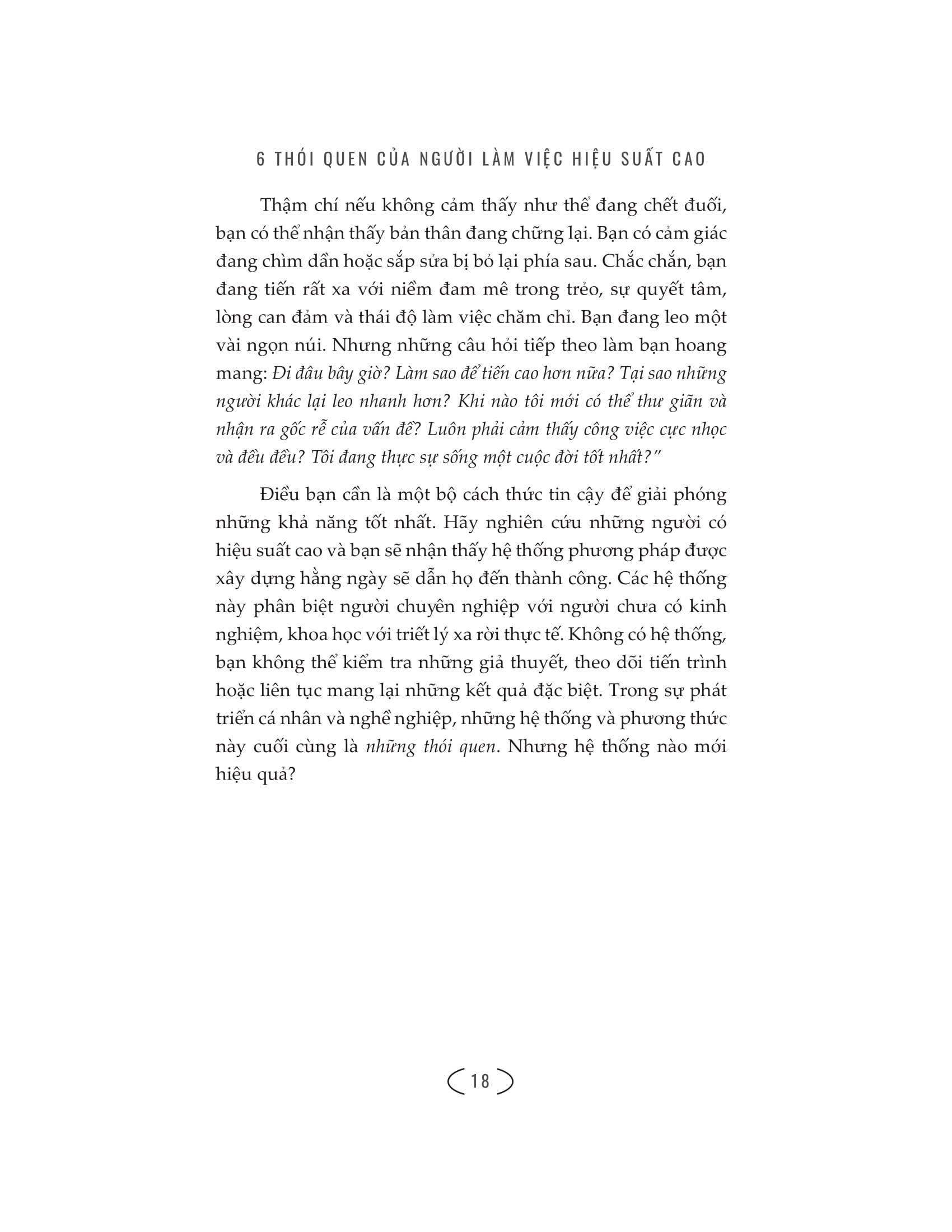 - Thể hiện lòng can đảm Cuốn sách “High performance habits – 6 thói quen của người làm việc hiệu suất cao” diễn giải chi tiết cách thức để thực hành những thói quen này. Cuốn sách đã tổng hợp những nghiên cứu trong 20 năm của tác giả Brendon Burchard từ hoạt động huấn luyện của mình. Đây là các tổng kết đắt giá nhất có được nhờ các cuộc khảo sát, phỏng vấn tiêu chuẩn và các công cụ đánh giá chuyên nghiệp về những người có hiệu suất cao trên toàn thế giới. Tác phẩm hé lộ một người nên nắm bắt điều gì để trở thành một người hiệu suất cao – có thể tạo ra những cấp độ ngày càng tăng của hạnh phúc, sức khỏe và thành công lâu dài. Nếu bạn muốn hình thành một thói quen nào mới để thành công nhanh hơn, hãy chọn những thói quen trong cuốn sách này. Bất cứ ai cũng có thể thực hành chúng, và bạn sẽ thấy những điều phi thường xảy ra trong cuộc sống, các mối quan hệ và sự nghiệp. Nếu bạn muốn đạt được nhiều thứ hơn, lãnh đạo tốt hơn, phát triển kĩ năng nhanh hơn, hoặc đạt được nhiều niềm vui và tự tin hơn, “High performance habits – 6 thói quen của người làm việc hiệu suất cao” sẽ trợ giúp đắc lực cho bạn.