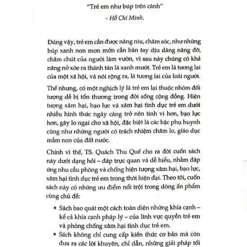 • "Cuốn sách này giới thiệu với bạn đọc về những khái niệm và thuật ngữ cơ bản; nhận biết về xâm hại tình dục trẻ em; kỹ năng phòng, chống xâm hại tình dục trẻ em; can thiệp, hỗ trợ khi trẻ có dấu hiệu bị xâm hại tình dục hoặc bị xâm hại tình dục và những quy định pháp lý liên quan đến bảo vệ trẻ em và xử lý khi trẻ em bị xâm hại tình dục." TS. Bùi Sỹ Lợi, Chuyên gia cao cấp, Đại biểu Quốc hội, Phó chủ nhiệm Ủy ban về các vấn đề xã hội của Quốc hội