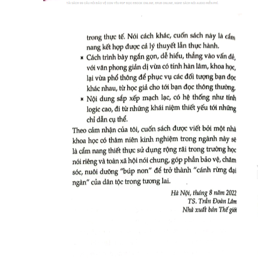 • Cuốn sách “99 Câu Hỏi Bảo Vệ Con Yêu PDF” được viết nhằm giải đáp những thắc mắc liên quan đến các vấn đề xâm hại, bạo lực và xâm hại tình dục đối với trẻ em. Tác giả TS. Quách Thu Quế đã trình bày các câu hỏi đáp trong sách dưới dạng trực quan và dễ hiểu, nhằm giúp người đọc nắm rõ những hiểm họa mà trẻ em đang phải đối mặt và cách bảo vệ con yêu của mình. Cuốn sách là một tài liệu hữu ích cho các bậc phụ huynh cũng như những người có trách nhiệm chăm sóc, giáo dục mầm non của đất nước.