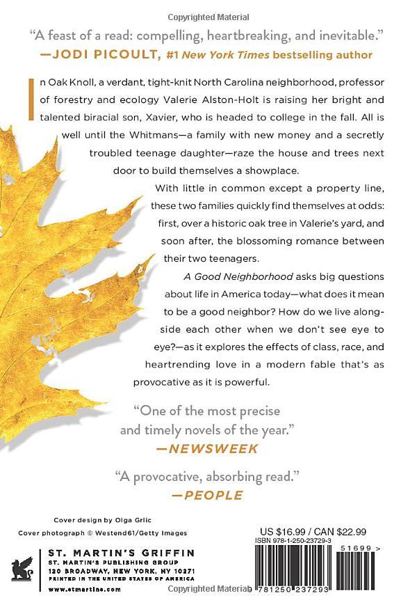 In Oak Knoll, a verdant, tight-knit North Carolina neighborhood, professor of forestry and ecology Valerie Alston-Holt is raising her bright and talented biracial son, Xavier, who’s headed to college in the fall. All is well until the Whitmans―a family with new money and a secretly troubled teenage daughter―raze the house and trees next door to build themselves a showplace.