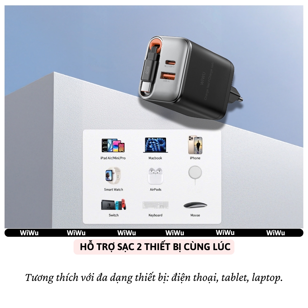 Mua tại TiktokBộ Sạc Nhanh GaN 67W WiWU Helix – Tích Hợp Dây Rút 70cm Nhỏ gọn – Siêu tốc – Chuẩn tiện lợi cho mọi hành trình! Bạn đã bao giờ gặp cảnh mang theo cả ổ sạc, dây sạc loằng ngoằng rồi lại quên mất đâu là đầu Type-C, đâu là củ sạc? WiWU Helix ra đời để dọn sạch đống rắc rối đó trong balo bạn. Điểm nổi bật của sản phẩm: Sạc siêu nhanh 67W – Công nghệ GaN hiện đại, truyền năng lượng hiệu quả, không nóng máy, bền bỉ theo thời gian. Tích hợp dây rút 70cm – Chỉ cần kéo nhẹ để dùng, thu gọn sau khi sạc – không còn lo dây rối hay thất lạc dây sạc. 2 cổng sạc (USB-C & USB-A) – Linh hoạt sạc cùng lúc nhiều thiết bị: điện thoại, tablet, tai nghe, sạc dự phòng,… Tương thích nhiều giao thức sạc nhanh (PD & QC) – Dù bạn dùng điện thoại hệ nào, WiWU Helix đều hỗ trợ tốc độ sạc tối ưu. Chip thông minh tích hợp – Tự động nhận diện thiết bị và điều chỉnh công suất phù hợp, bảo vệ pin và thiết bị khỏi quá nhiệt, quá dòng. Phù hợp cho: