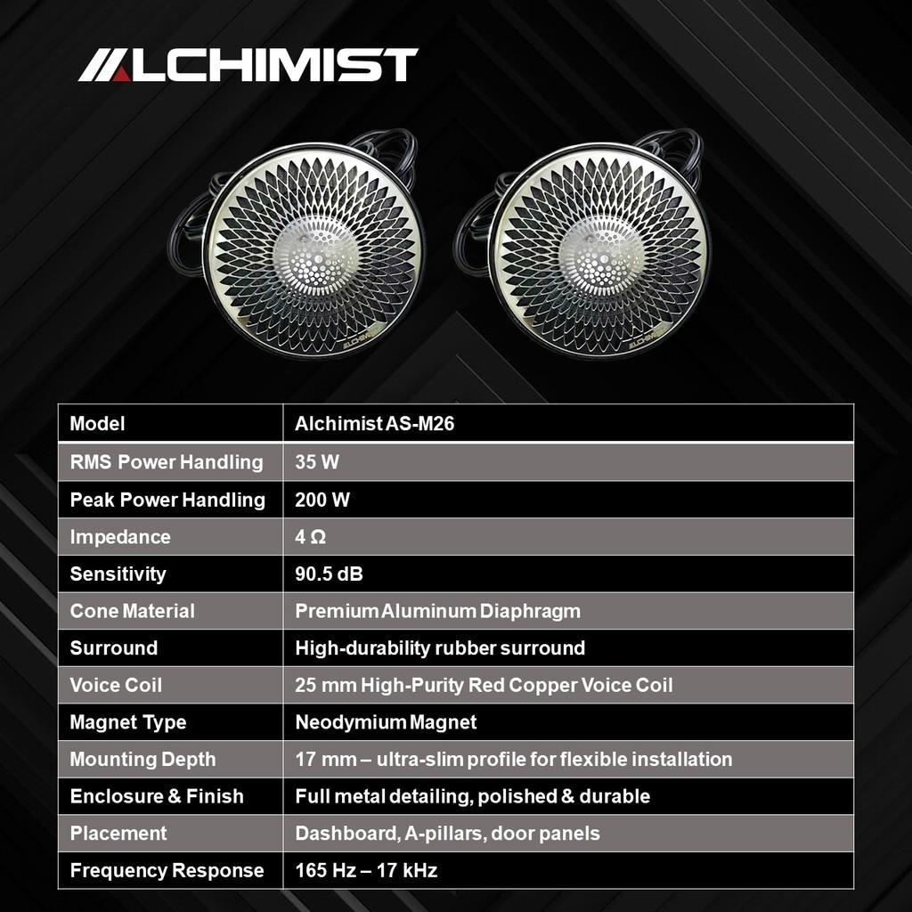 Alchimist AS-M26 là dòng loa được thiết kế tối ưu cho dải tần trung và cao, mang lại độ chi tiết vượt trội, độ động tốt và khả năng tái tạo âm thanh chính xác. Whether you're upgrading a factory system or building a custom audiophile-grade setup, AS-M26 delivers clarity, control, and tonal balance that meet the expectations of serious listeners.