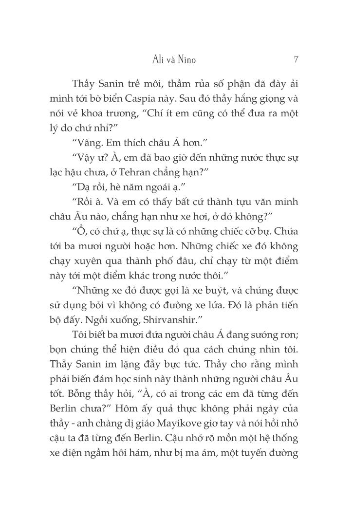 Nhưng, Ali và Nino không chỉ là một câu chuyện tình. Bằng giọng kể Nghìn lẻ một đêm, nó cuốn ta đi lên rừng, xuống biển, bằng sa mạc, rù quến ta trong những vẻ đẹp nên thơ và những bí ẩn gợi hoặc của miền đất giao thoa giữa Đông và Tây. Với tầm vóc sử thi, nó lại nhấn chìm ta trong bóng đen của cuộc Thế chiến thứ nhất, khi mối đe dọa chiến tranh bắt đầu xé toạc những lỗ hổng trong cái cộng đồng đa văn hóa, đa sắc tộc từ hàng bao thế kỷ, buộc những cư dân bất kể tôn giáo phải đưa ra lựa chọn: hướng về phương Tây với những biến đổi hiện đại chóng mặt, hay bám giữ lấy phương Đông của tinh thần, của thi ca, của truyền thống hàng trăm thế hệ. Để rồi cuối cùng, nó lại đưa ta trở về với thiên tình sử nồng nàn và bi thương, một nốt trầm lặng da diết khiến Ali và Nino trở nên một kiệt tác bất diệt như những đụn cát sa mạc.