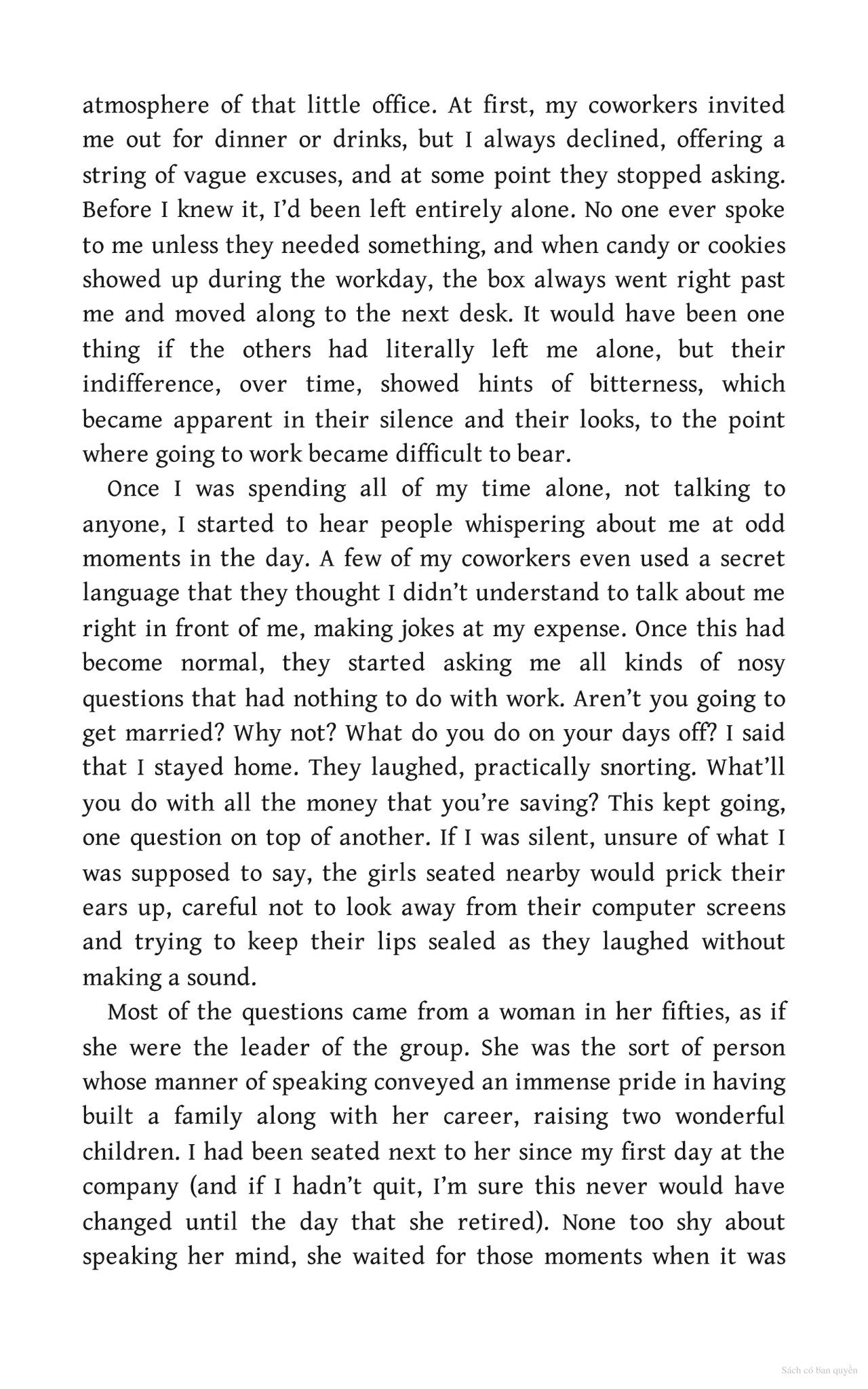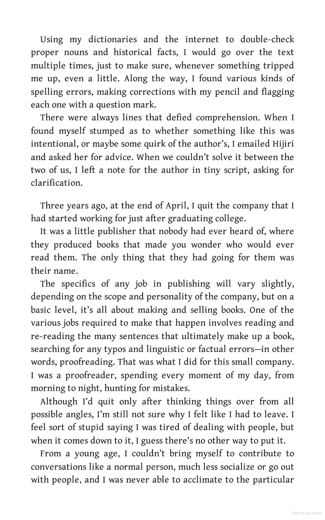 Fuyuko Irie is a freelance proofreader in her thirties. Living alone in an overwhelming city and unable to form meaningful relationships, she has little contact with anyone other than her colleague, Hijiri. But a chance encounter with a man named Mitsutsuka awakens something new in her. Through their weekly meetings, Fuyuko starts to see the world in a different light and still, painful memories from her past begin to resurface.
