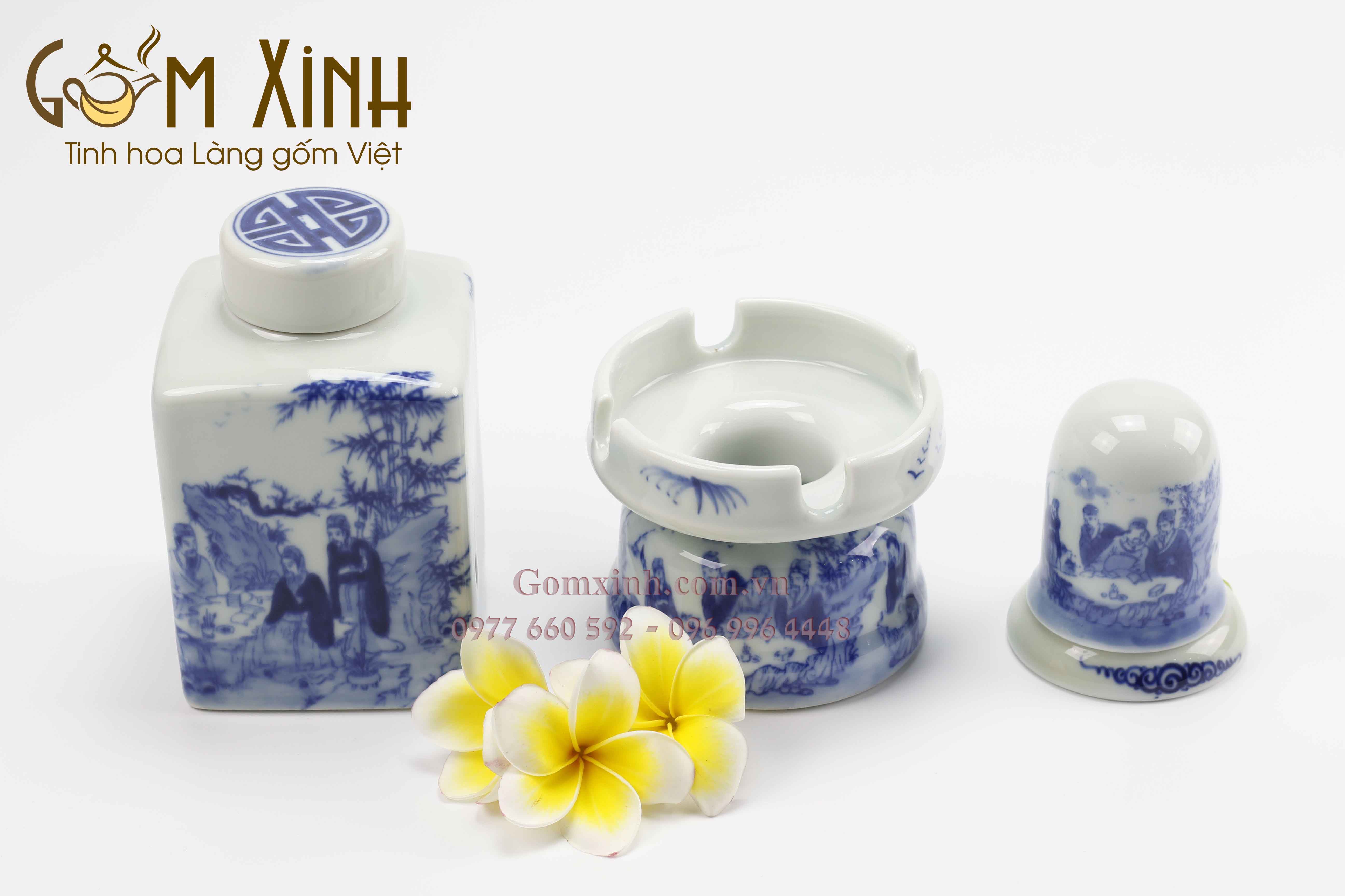 Bộ ấm chén men lam cổ Bát Tràng vẽ Trúc lâm thất hiền được làm thủ công tại làng nghề Bát Tràng.