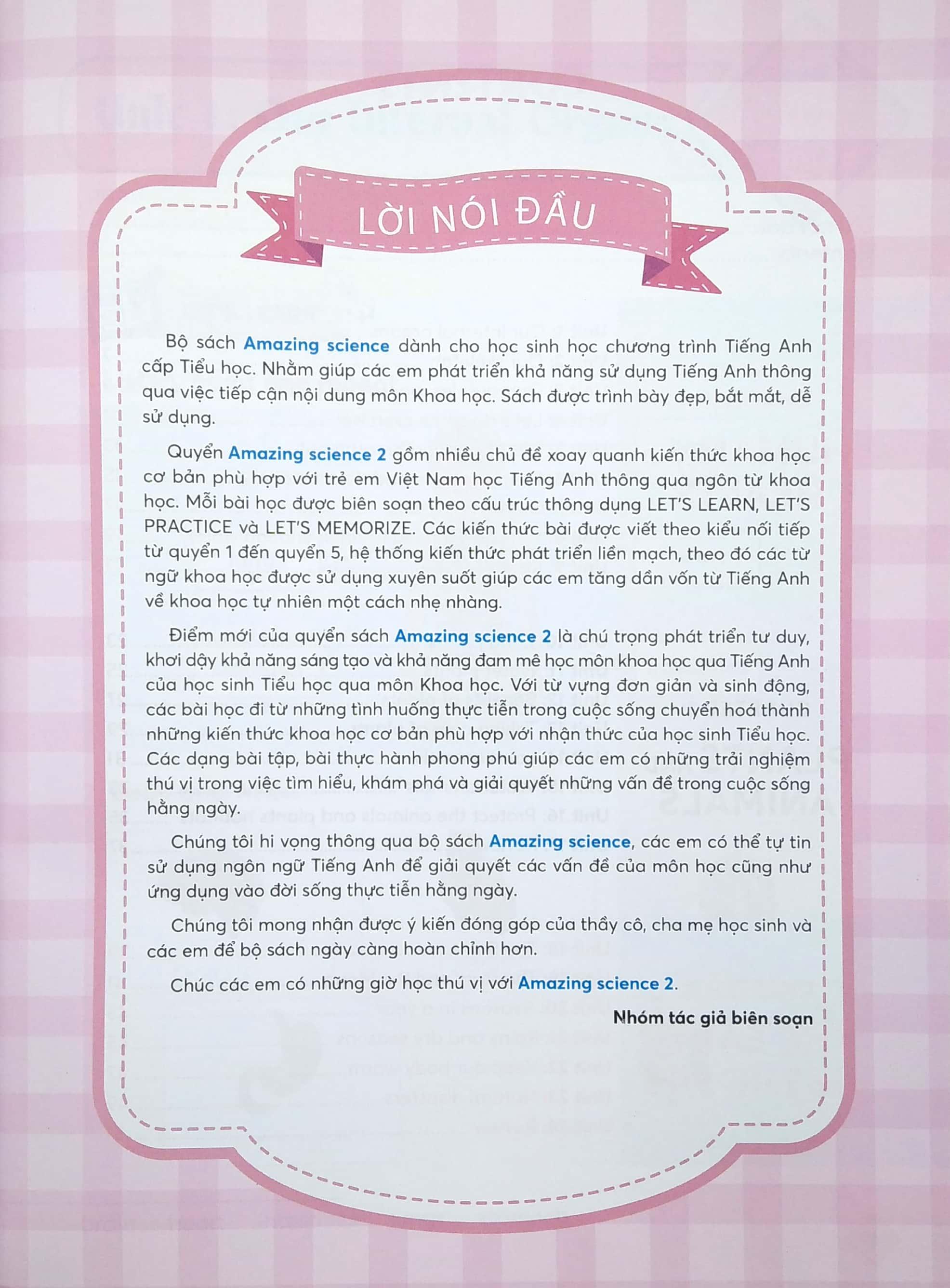 Quyển Amazing science 2 gồm nhiều chủ đề xoay quanh kiến thức khoa học 1 cơ bản phù hợp với trẻ em Việt Nam học Tiếng Anh thông qua ngôn từ khoa học. Mỗi bài học được biên soạn theo cấu trúc thông dụng LET'S LEARN, LET'S PRACTICE và LET'S MEMORIZE. Các kiến thức bài được viết theo kiểu nối tiếp từ quyển 1 đến quyển 5, hệ thống kiến thức phát triển liền mạch, theo đó các từ ngữ khoa học được sử dụng xuyên suốt giúp các em tăng dần vốn từ Tiếng Anh về khoa học tự nhiên một cách nhẹ nhàng