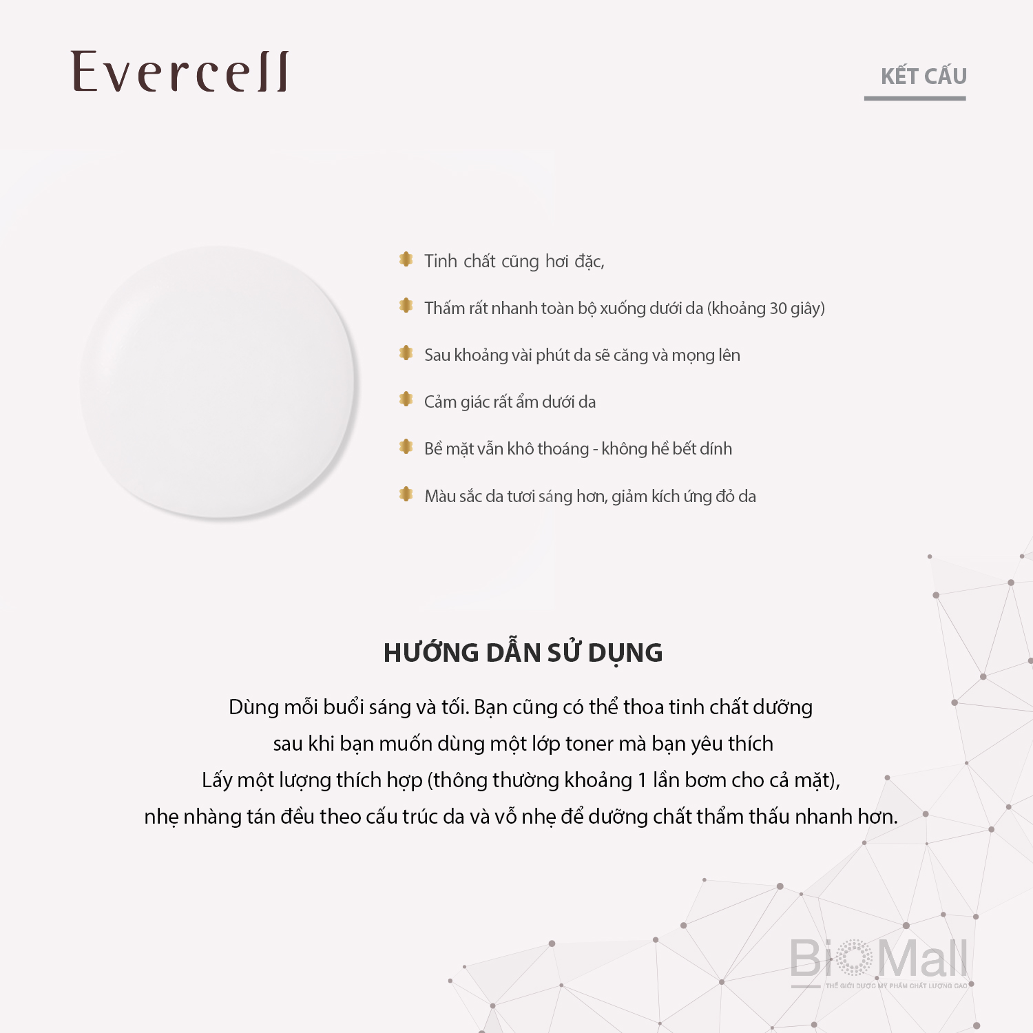 Công dụng sản phẩm: - Dưỡng ẩm sâu, ngăn ngừa kích ứng da. - Giúp giảm nếp nhăn, làm trắng, giảm sự xuất hiện của các đốm đen, làm mờ vết nám, sạm da. -