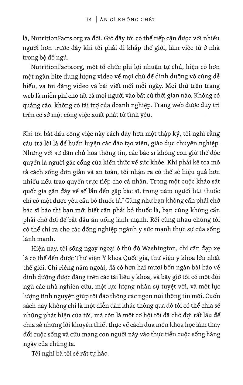 Rất nhiều cái chết trẻ có thể ngăn ngừa được đơn giản bằng những thay đổi trong chế độ ăn và lối sống. Trong cuốn Ăn gì không chết, bác sĩ Michael Greger, bác sĩ, chuyên gia dinh dưỡng nổi tiếng quốc tế, và là nhà sáng lập , nghiên cứu tỉ mỉ 15 nguyên nhân hàng đầu dẫn đến chết trẻ ở Hoa Kỳ – bệnh tim, ung thư, tiểu đường, Parkinson, cao huyết áp, và nhiều bệnh khác – giải thích tại sao can thiệp dinh dưỡng và lối sống đôi khi có thể thành công hơn thuốc kê toa và các giải pháp phẫu thuật và thuốc men khác, cho chúng ta sống khỏe mạnh hơn.
