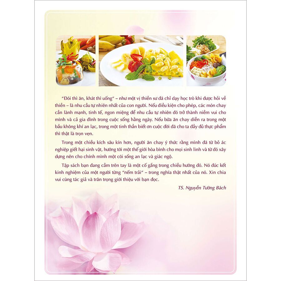 " Đói thì ăn, khát thì uống" - như một vị thiền sư đã chỉ dậy học trò khi được hỏi về thiền - là nhu cầu tự nhiên nhất của con người. Nếu điều kiện cho phép, các món chay cần lành mạnh, tinh tê, ngon miệng để nhu cầu tự nhiên đó trở thành niềm vui cho mình và cả gia đình trong cuộc sống hàng ngày. Nếu bữa ăn chay diễn ra trong một bầu không khí an lạc, trong một tinh thần biết ơn cuộc đời đã cho ta đầy đủ thực phẩm thì thật là trọn vẹn.