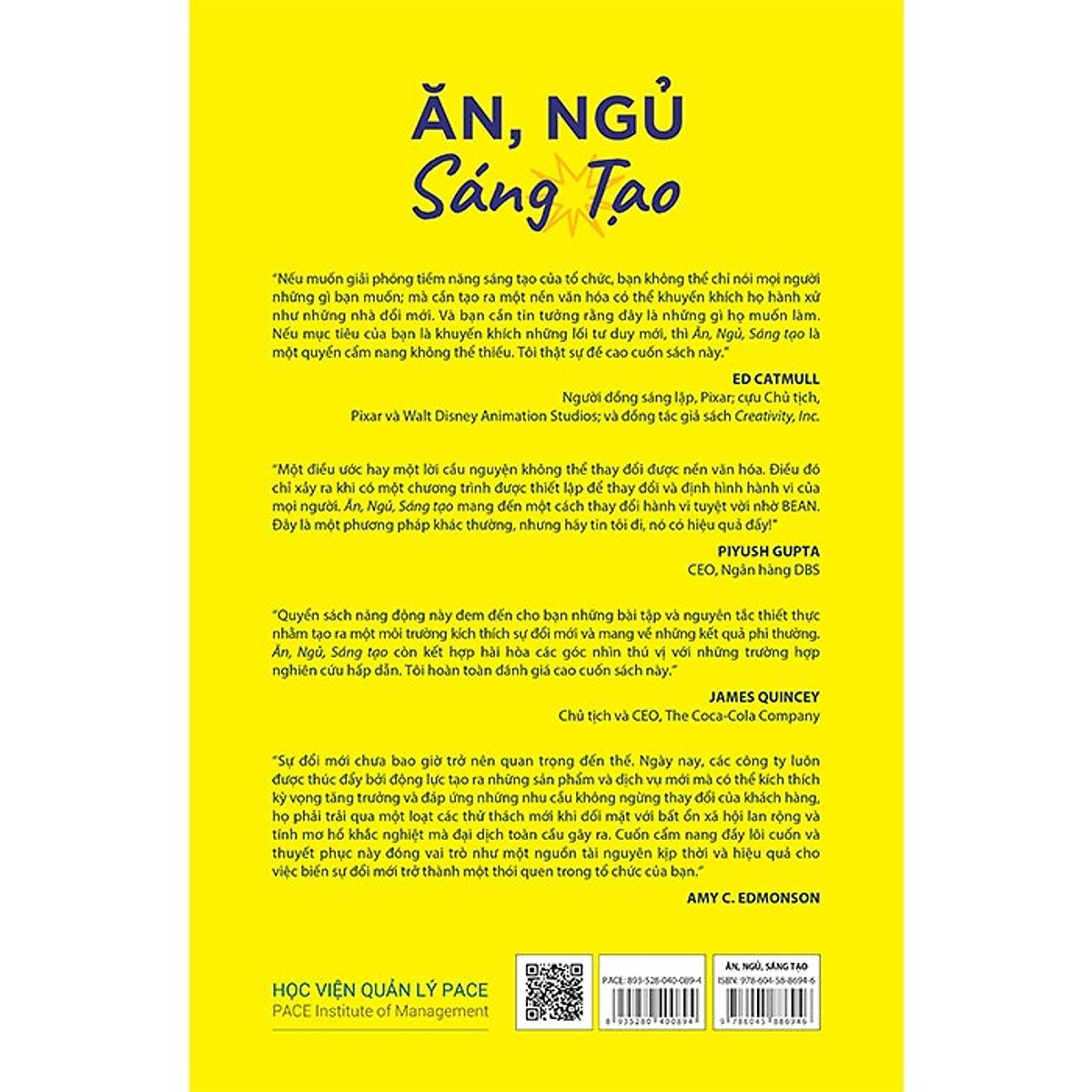 “Nếu muốn giải phóng tiềm năng sáng tạo của tổ chức, bạn không thể chỉ nói mọi người những gì bạn muốn; mà cần tạo ra một nền văn hóa có thể khuyến khích họ hành xử như những nhà đổi mới. Và bạn cần tin tưởng rằng đây là những gì họ muốn làm. Nếu mục tiêu của bạn là khuyến khích những lối tư duy mới, thì Ăn, Ngủ, Sáng tạo là một quyển cẩm nang không thể thiếu. Tôi thật sự đề cao cuốn sách này.” - Ed Catmull; Người đồng sáng lập, Pixar; cựu Chủ tịch, Pixar và Walt Disney Animation Studios; và đồng tác giả sách Creativity, Inc.