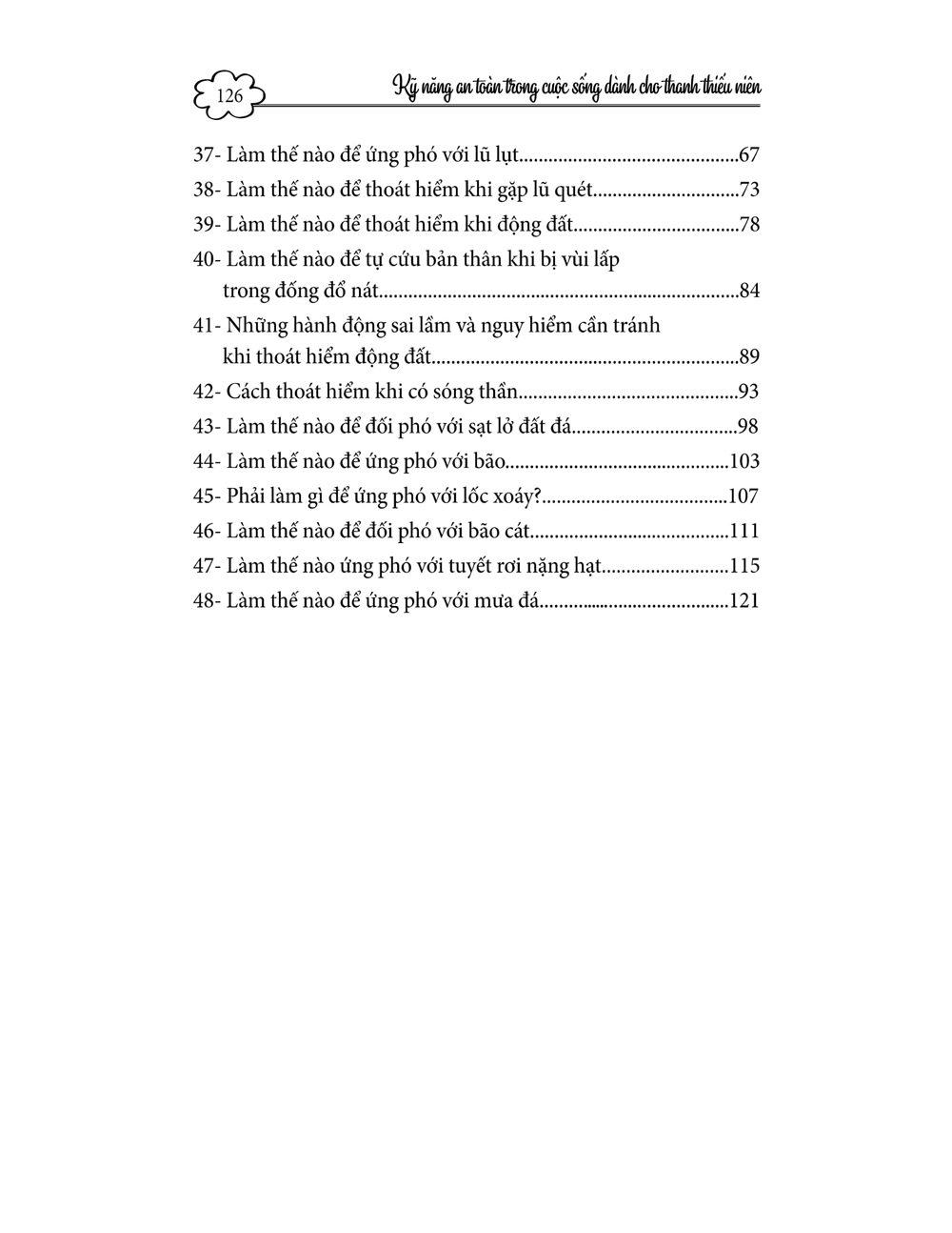 An toàn khi tham gia các hoạt động ngoài trời và phòng chống thiên tai cung cấp một số kiến thức, kỹ năng đảm bảo an toàn khi tham gia các hoạt động ngoài trời, hạn chế tối đa nguy cơ xảy ra các sự cố ngoài ý muốn; những đặc trưng, quy luật của thiên tai để từ đó đưa ra những dự đoán và biện pháp phòng chống, giúp tự bảo vệ an toàn của bản thân, giảm thiểu những tổn thất do thiên tai gây ra xuống mức thấp nhất.