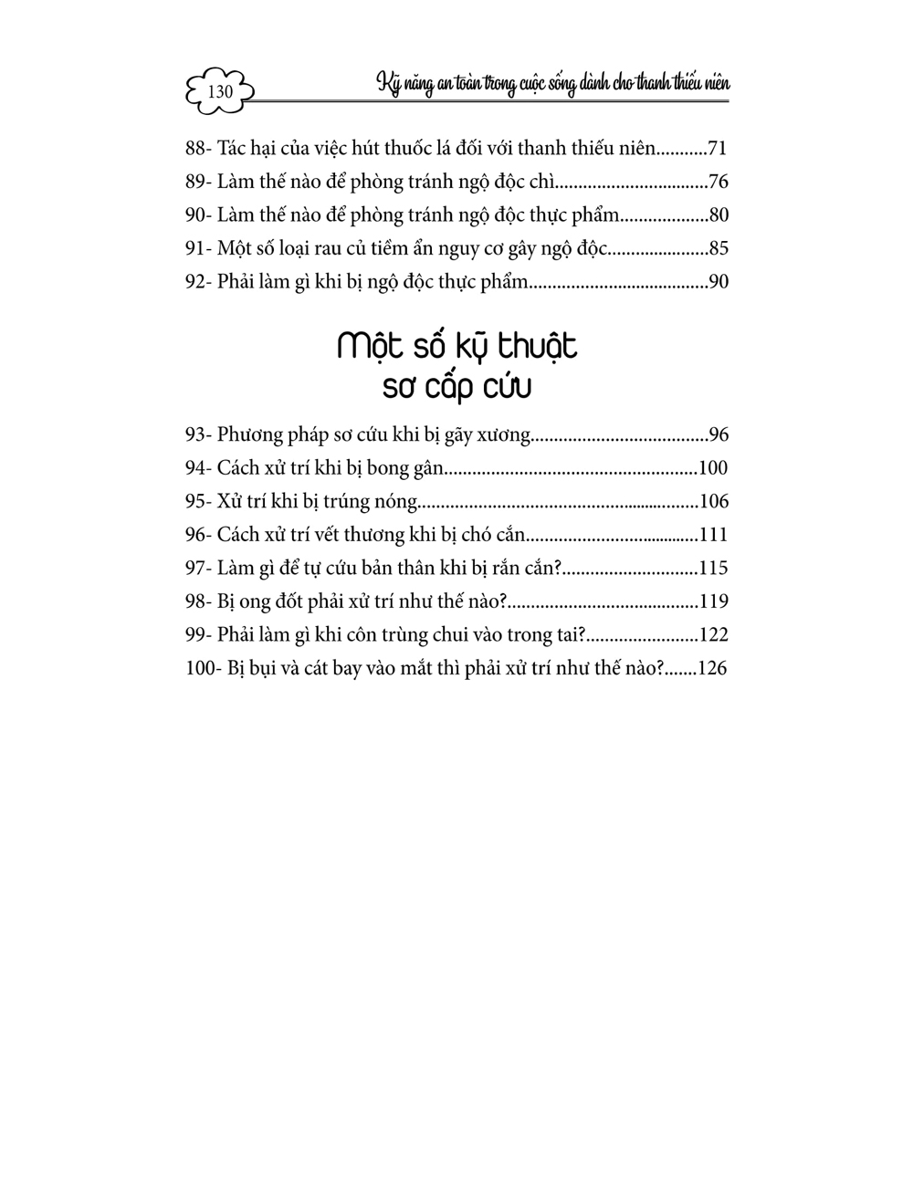 An toàn trong ăn uống và sơ cấp cứu cung cấp những kiến thức về phòng cháy chữa cháy cũng như kỹ năng thoát hiểm an toàn, những kiến thức về vệ sinh an toàn thực phẩm, đề phòng bị ngộ độc thức ăn, cách ăn uống một cách khoa học để trưởng thành một cách khỏe mạnh, một số kỹ thuật sơ cấp cứu giúp bảo toàn tính mạng cho nạn nhân, người thân và chính bản thân mình.