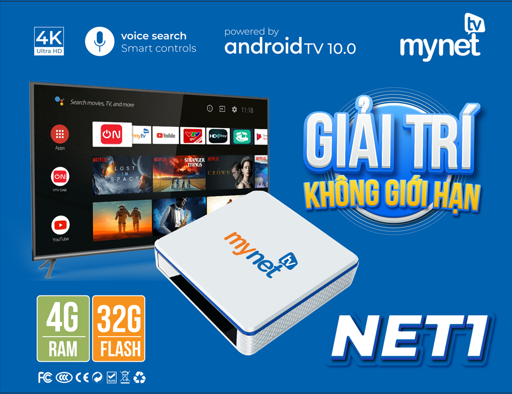 - MYNET TV 4H sử dụng hệ điều hành Android 10 cùng giao diện Android TV giúp trải nghiệm thân thiện trên TV, đặc biệt hỗ trợ ra lệnh bằng giọng nói trơn tru, giúp bạn có những trải nghiệm tuyệt vời.