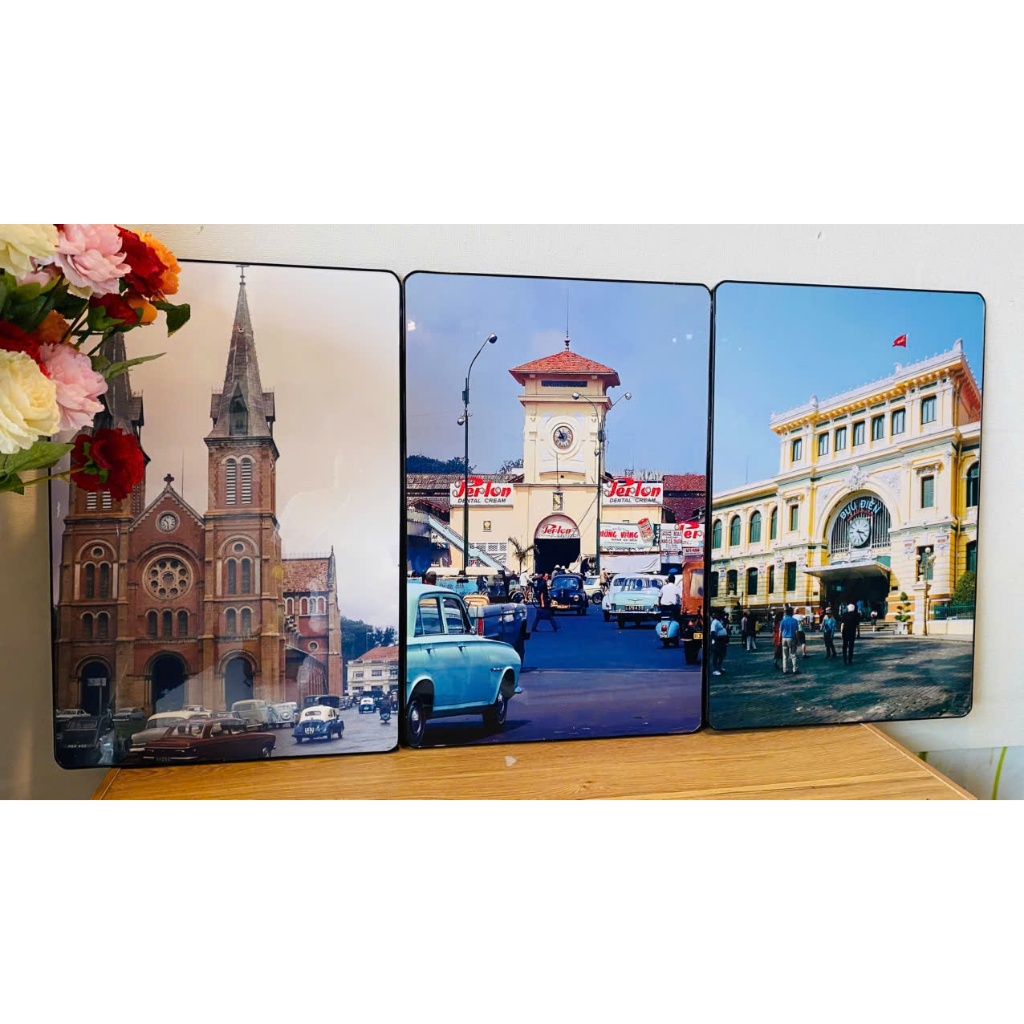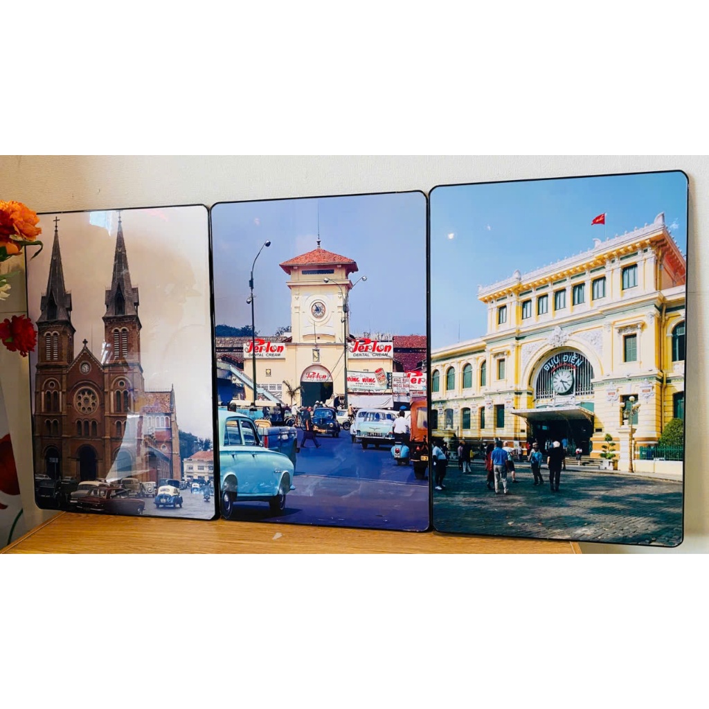 Tranh treo tường cảnh sài gòn - Kích thước của tranh : Kích thước : Size 1: 30x45cmx2 tấm+45x65cmx1 tấm Size 2: 40x60cmx2 tấm + 60x80x1 tấm) Size 3:50x70cmx2 tấm + 70x90x1 tấm) - Chất