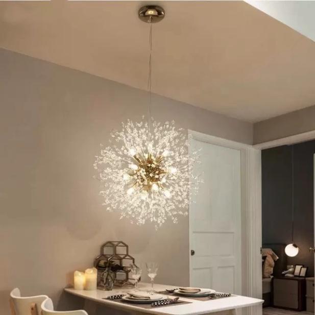 Đèn được xây đắp các thanh pha le nhỏ hình dáng tua, gắn vào chỗ này là khối hệ thống đèn điện làm cảm giác phát sáng lung linh, sang trọng