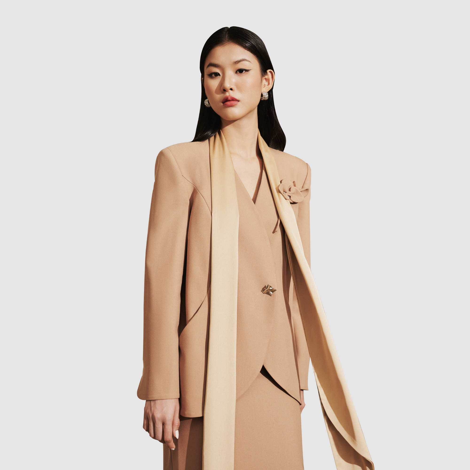 Mua tại Tiktok- Mô tả INFINITY / OLIVE Áo blazer không cổ, tay dài, vạt thân trước tròn, mở túi cong theo đường bổ, kèm dây lụa vạt chéo, có hoa đính ngực trái.
