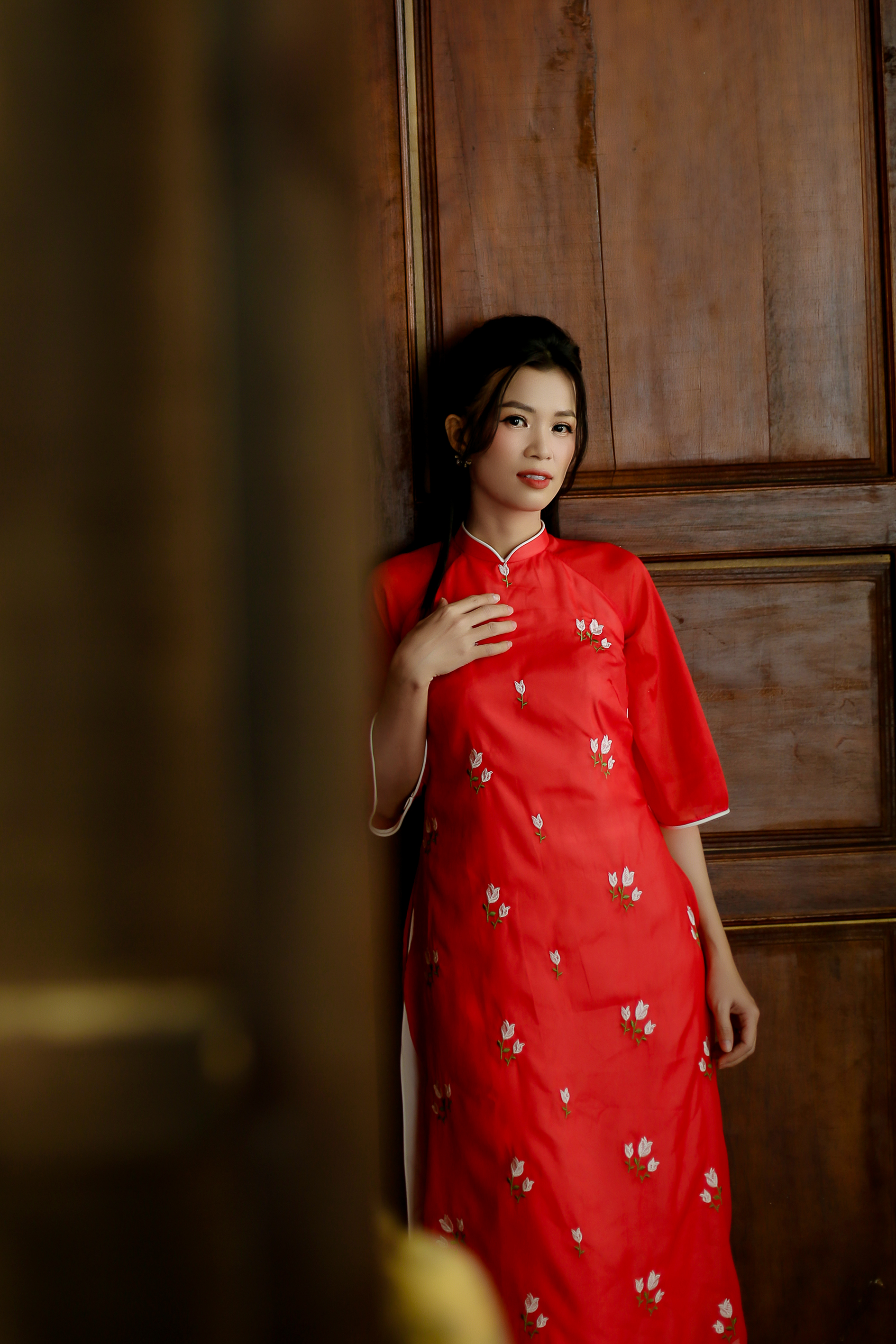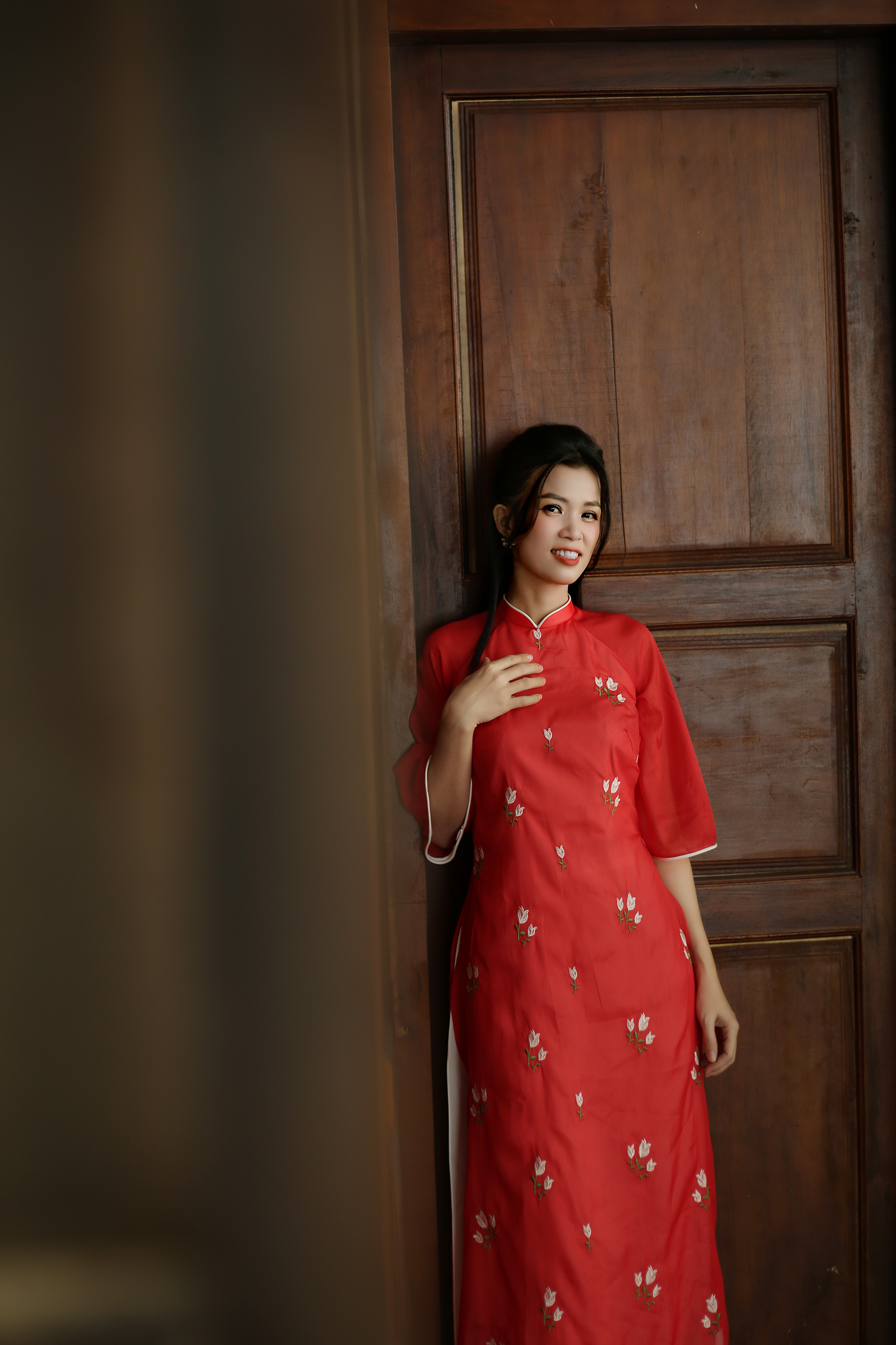 áo dài đỏ form suong may chất liệu lụa gấm kết hoa sen, tay lỡ loe, quần lụa trắng
